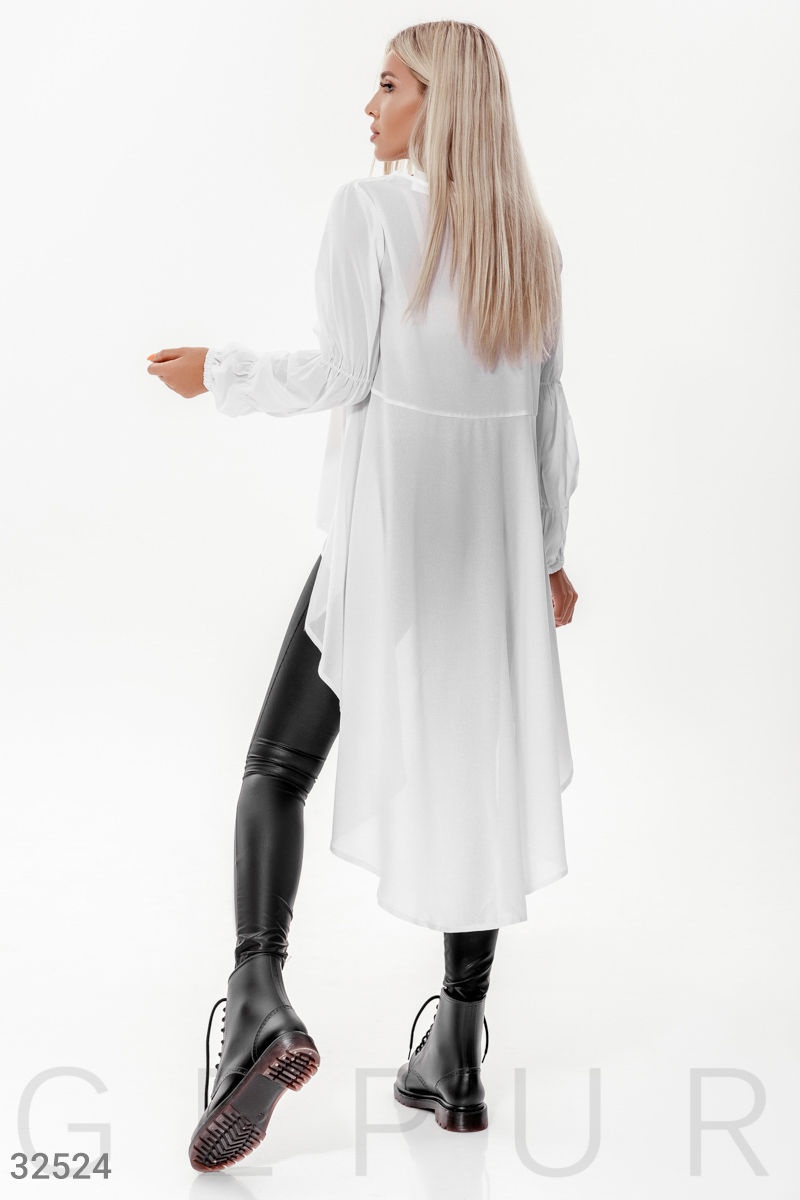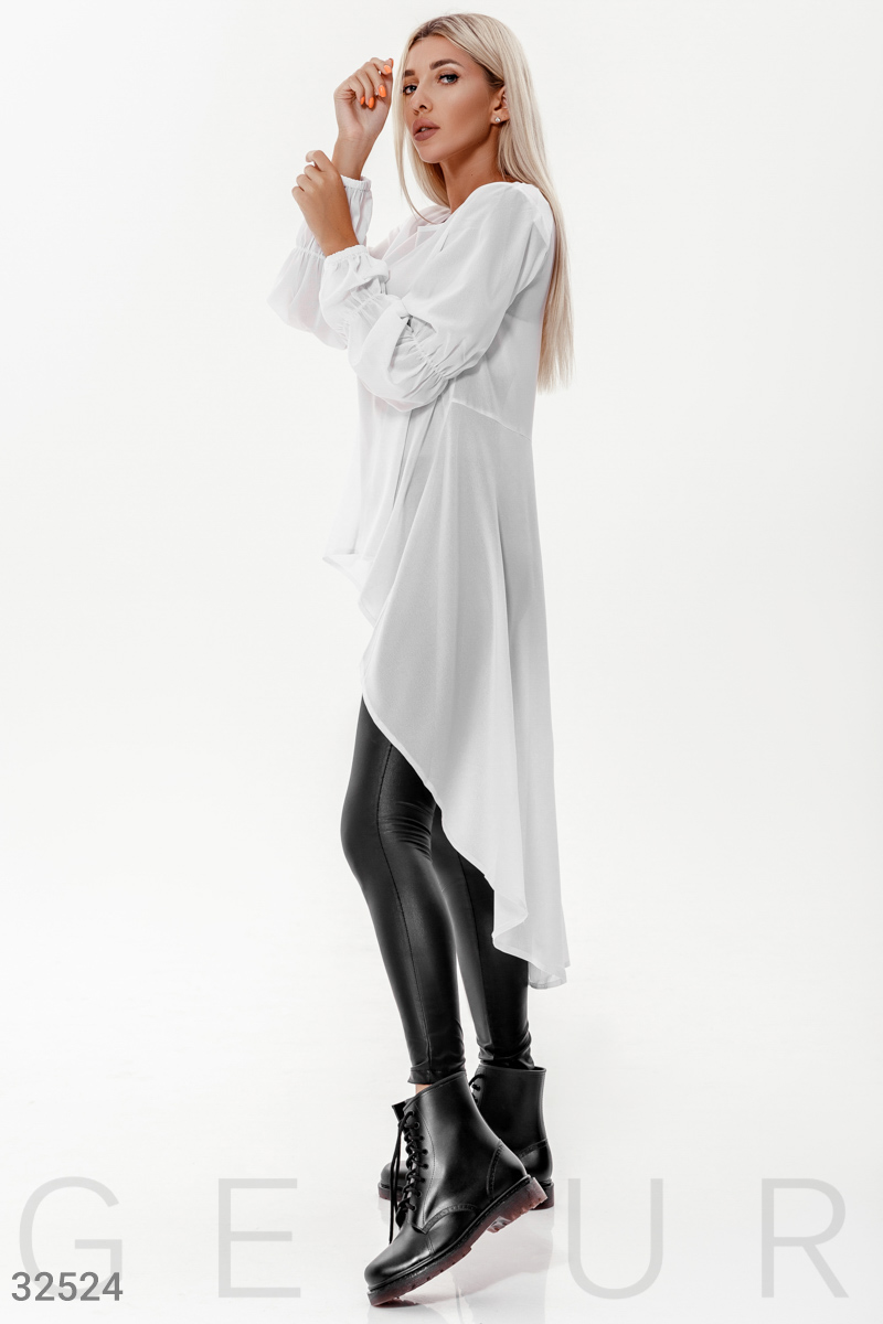 Легкий черно-белый костюм: асимметричная шифоновая туника-oversize с длинным эффектным рукавом на эластичной манжете и удлиненной спинкой, леггинсы из эко-кожи зауженного кроя и с эластичной вставкой на поясе. ..