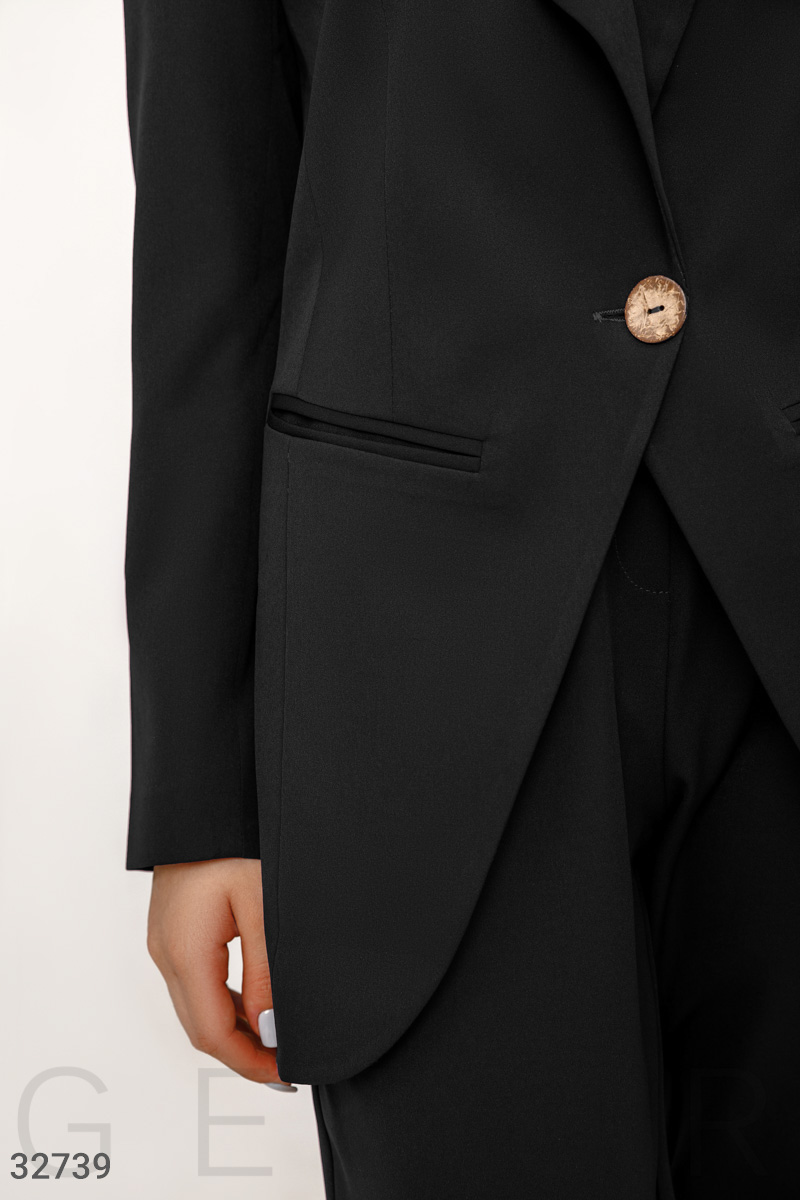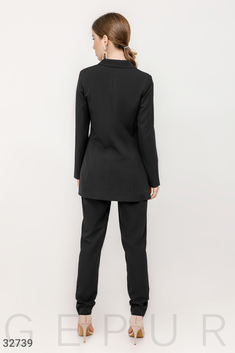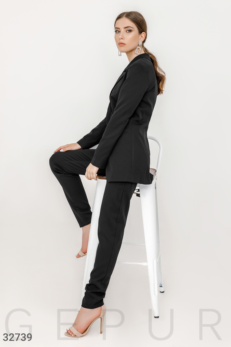 Костюм в деловом стиле: удлиненный однобортный жакет на подкладе, с отложным воротником, лацканами, двумя прорезными карманами, облегающие брюки средней посадки с двумя прорезными карманами. ..