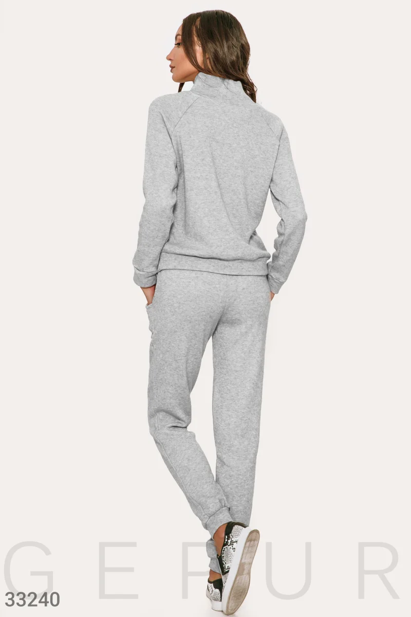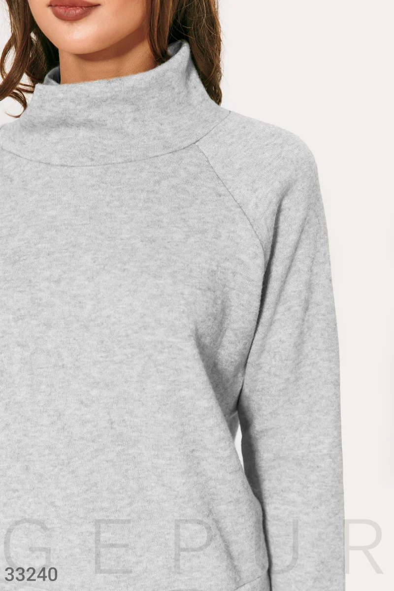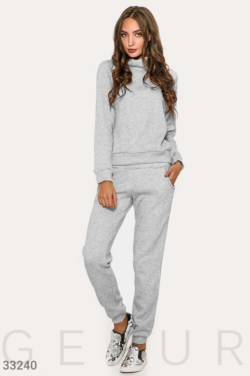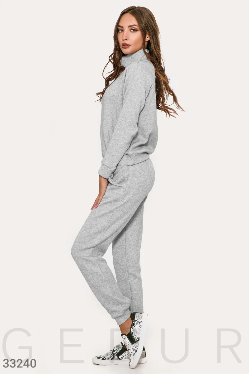 Уютный трикотажный костюм серого цвета: джемпер с воротником-гольф, длинным рукавом, брюки-джоггеры средней посадки с эластичной вставкой на поясе и двумя прорезными карманами. ,