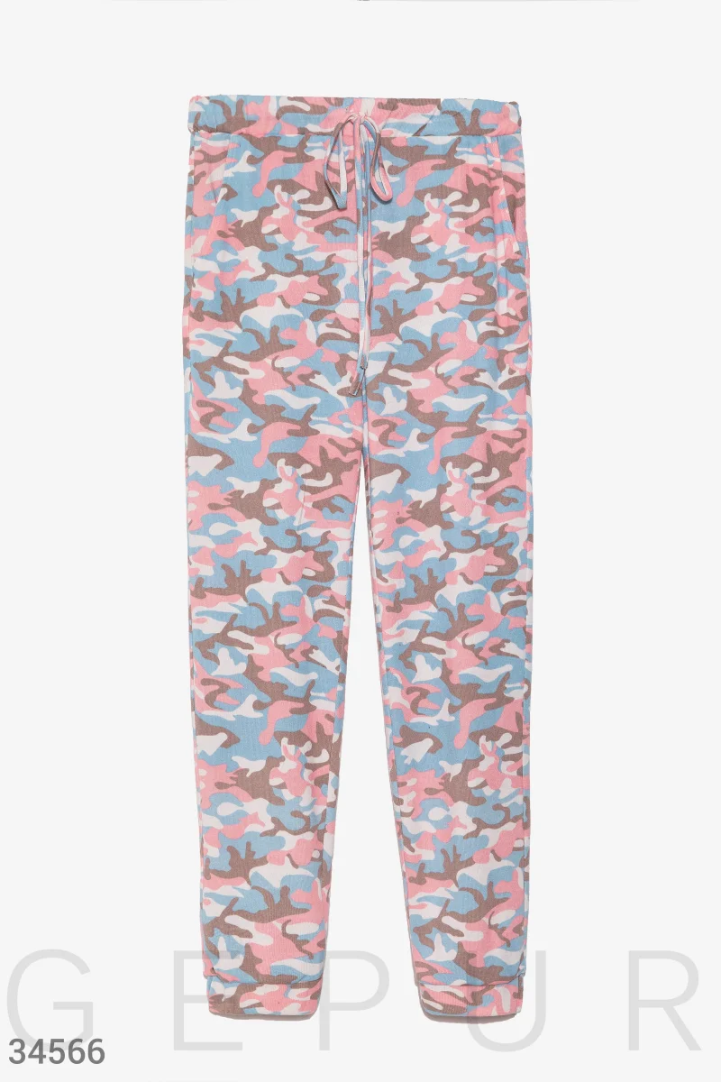 Для создания уютной женской пижамы мастера марки использовали мягкую трикотажную ткань. Материал прекрасно пропускает воздух, а также не вызывает аллергию. Однотонный джемпер гармонично смотрится в дуэте с брюками прямого кроя, декорированными ярким геометричным принтом.