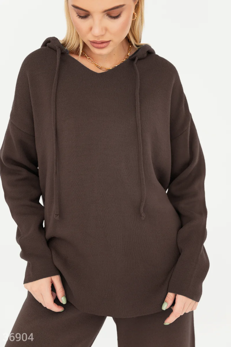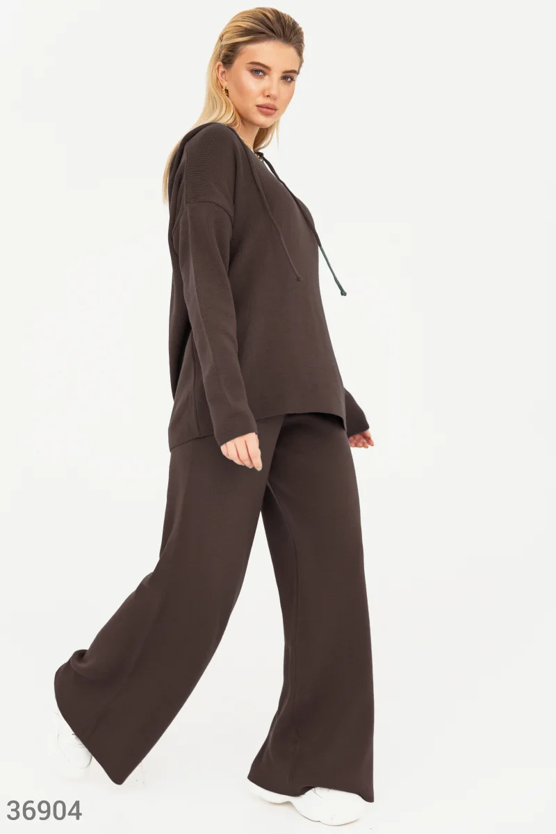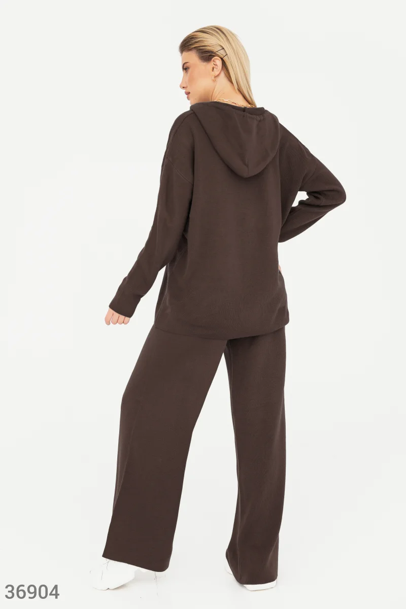 Костюм шоколадного оттенка поддерживает модную тенденцию на oversize-крой. Модель состоит из свободного худи и широких брюк, сделанных из трикотажа в рубчик. Материал отличается не только своей мягкостью, но и фактурностью.