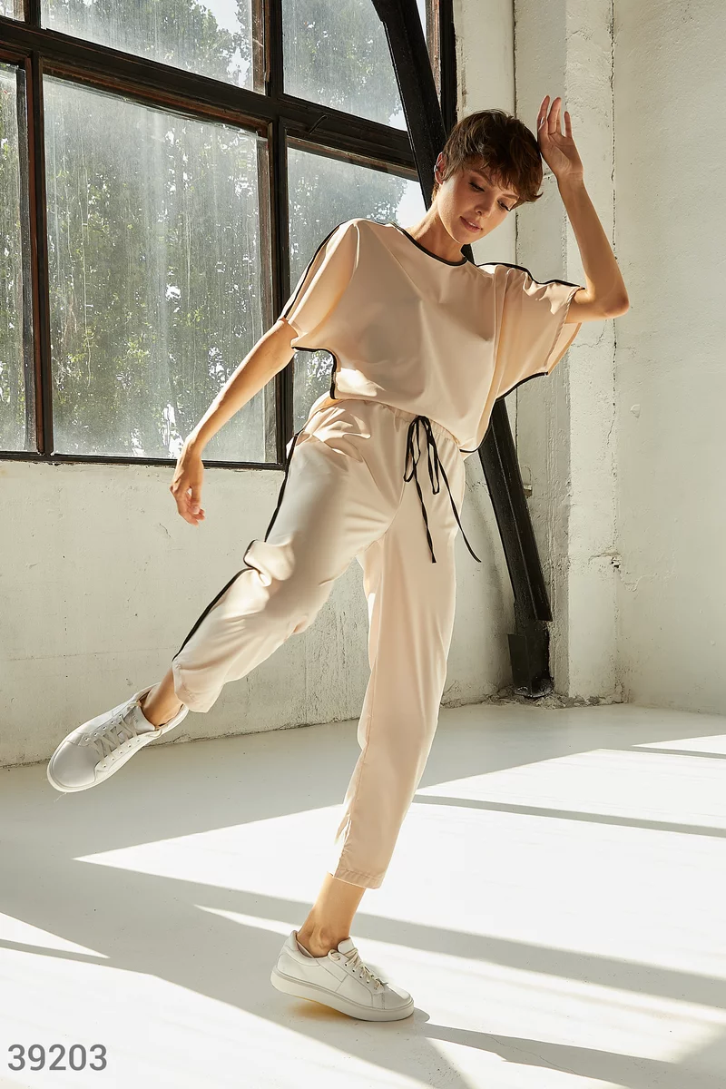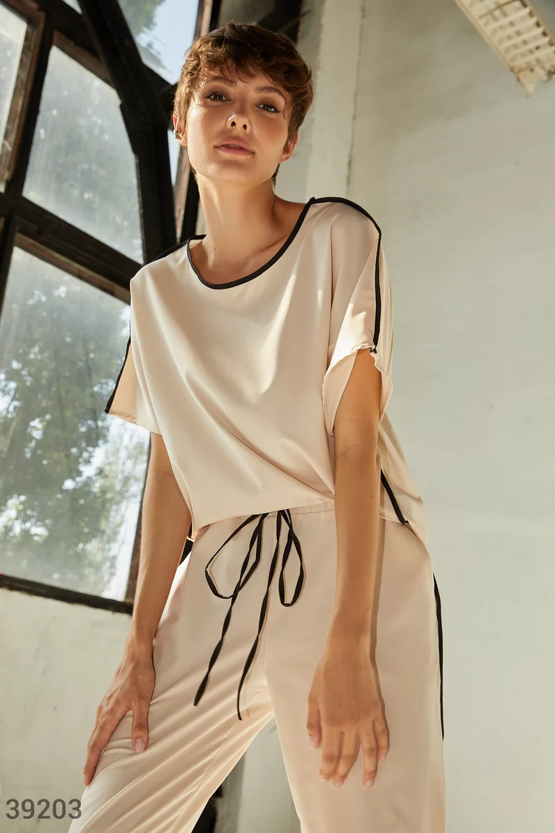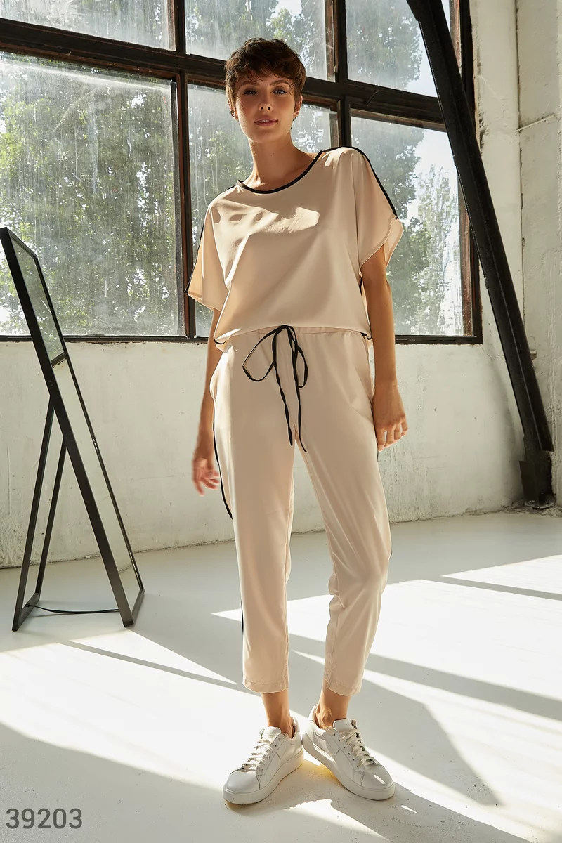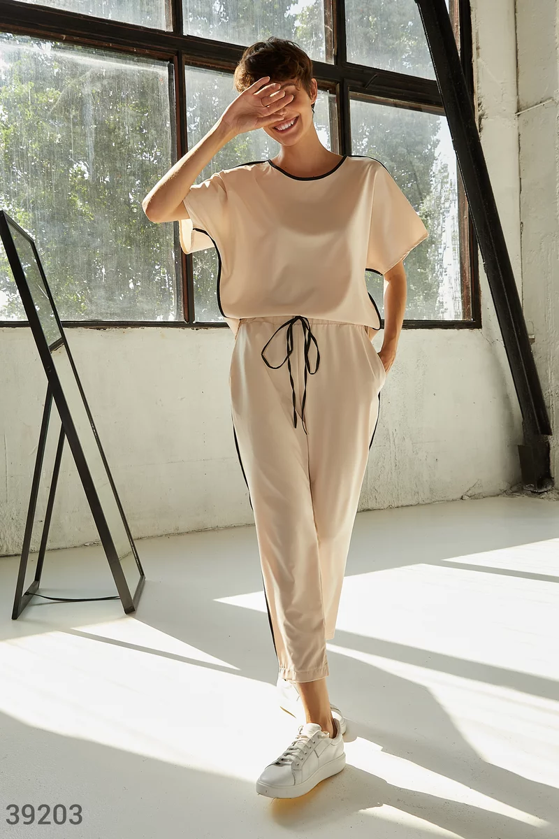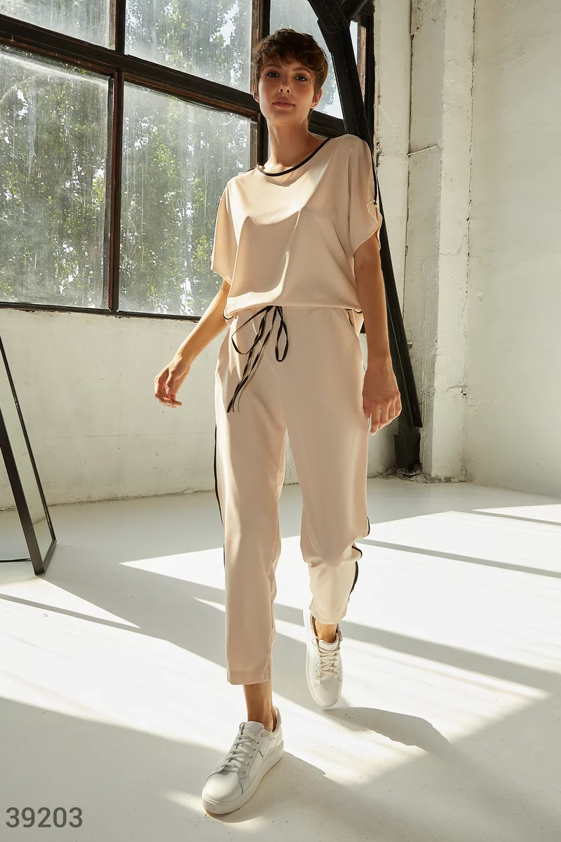 Костюм из легкой ткани базового бежевого цвета. Оверсайзная футболка с круглым вырезом, коротким рукавом и удлиненной спинкой, с черной вставкой по боковым швам и на горловине. Брюки с черными вставками и карманами по бокам и эластичной вставкой в поясе на завязках.