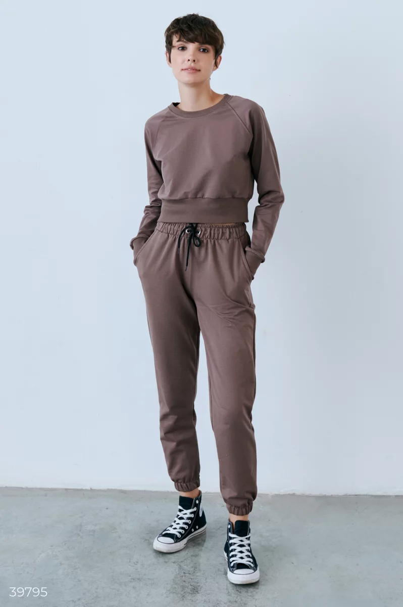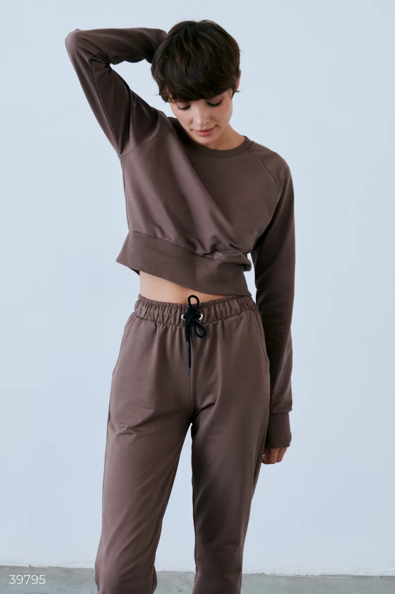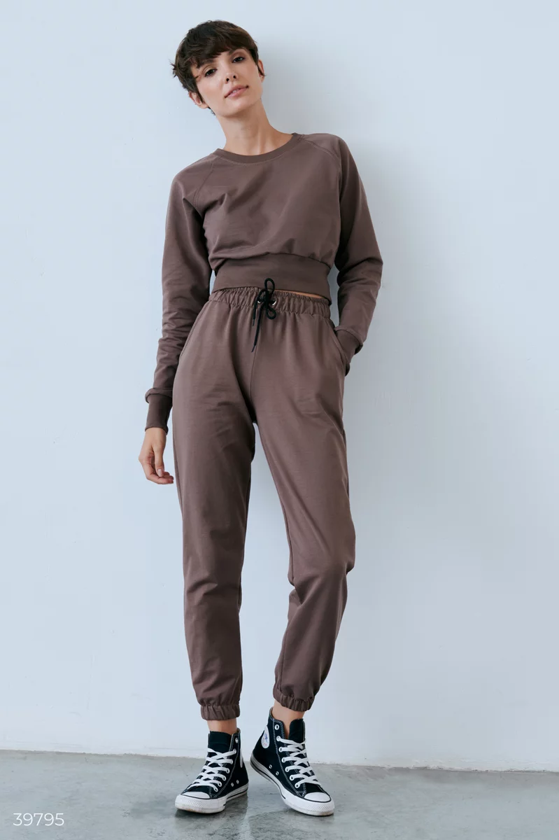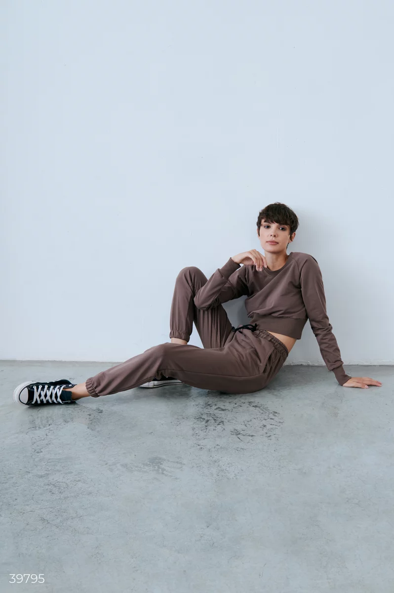 Костюм цвета мокко с укороченным свитшотом. Зауженные брюки с эластичной вставкой в поясе, завязывается на шнурок.