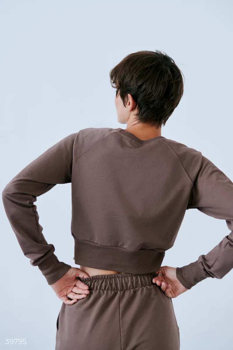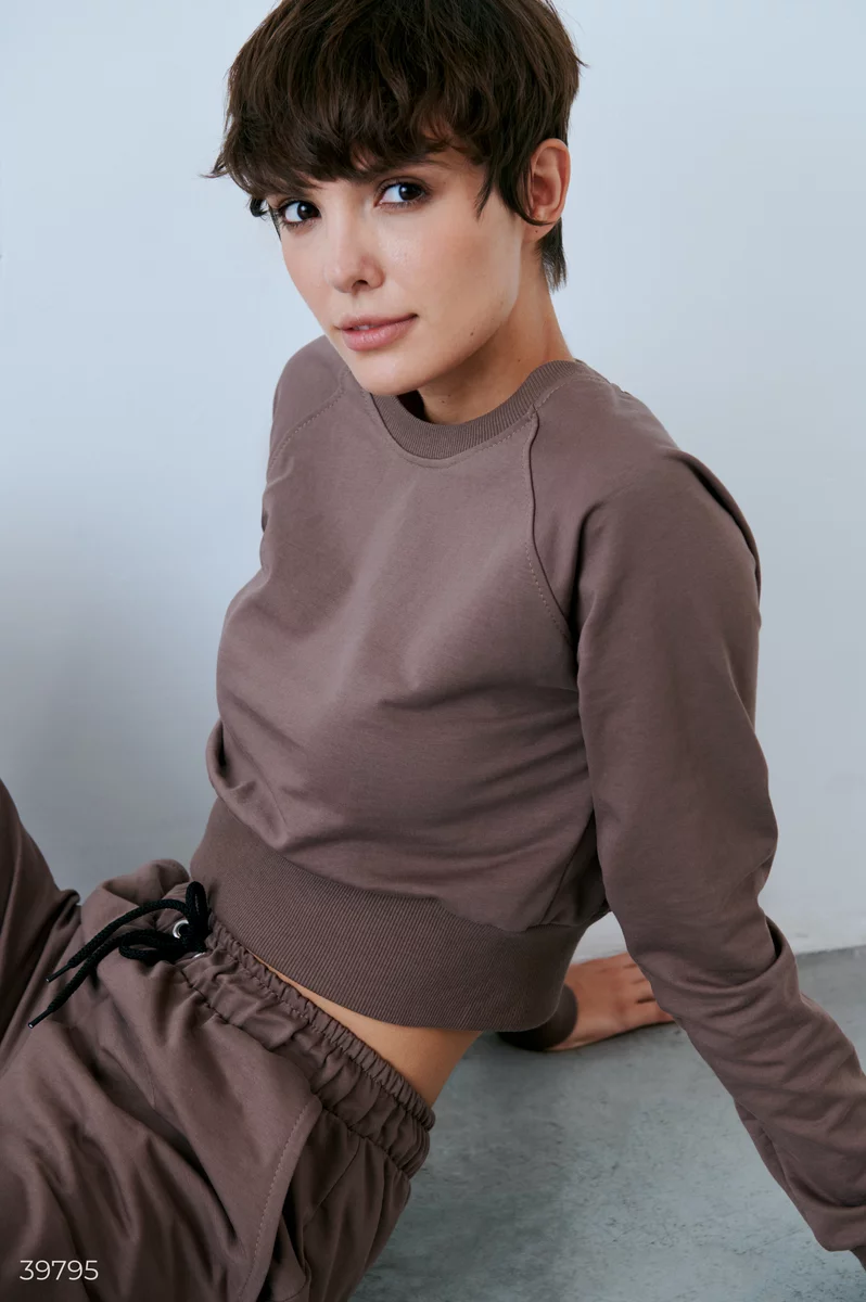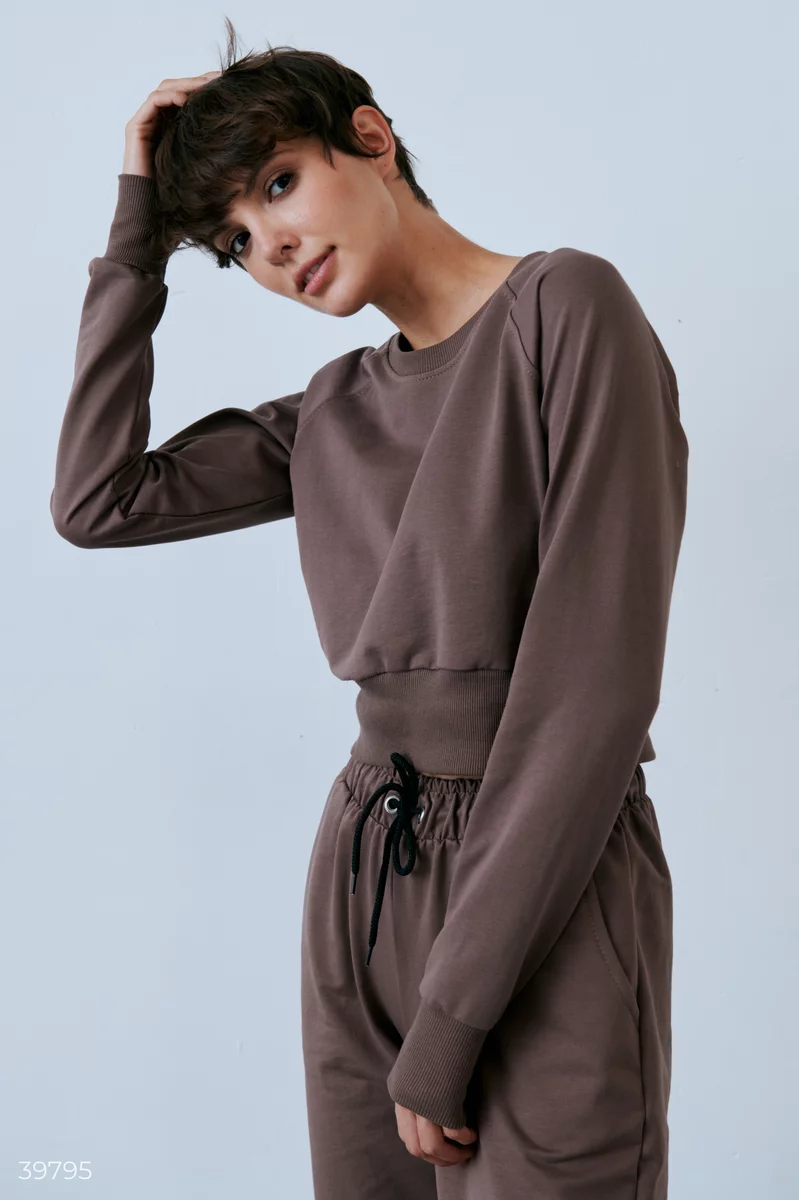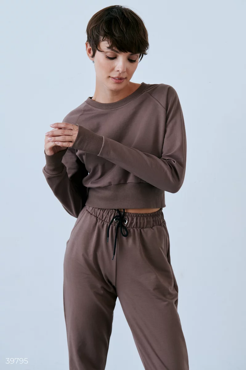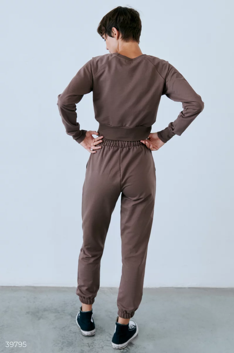 Костюм цвета мокко с укороченным свитшотом. Зауженные брюки с эластичной вставкой в поясе, завязывается на шнурок.