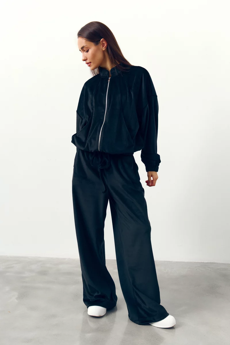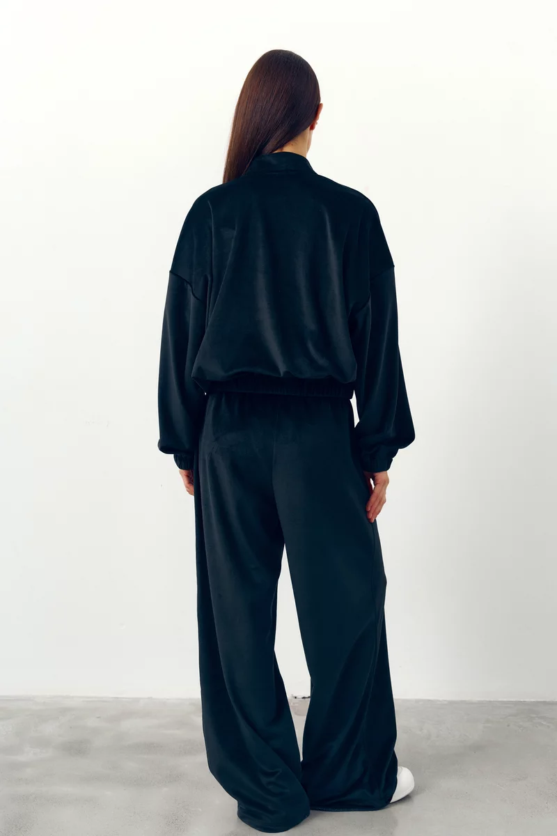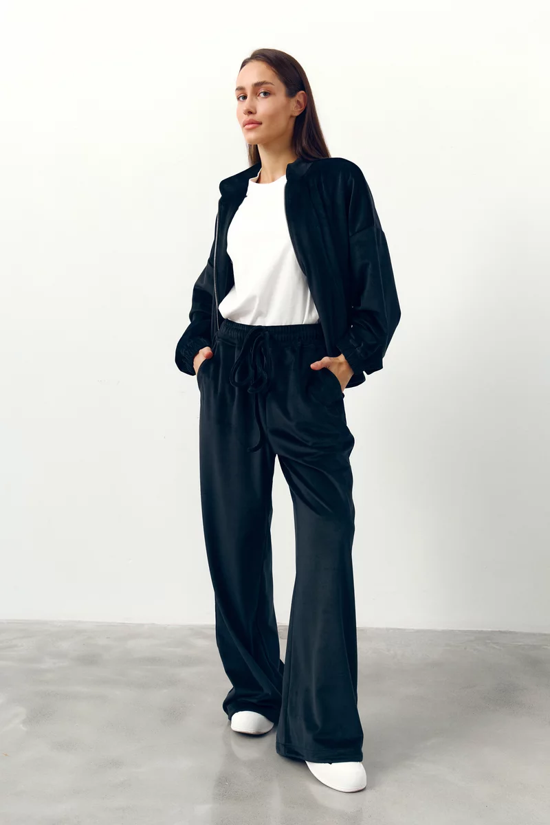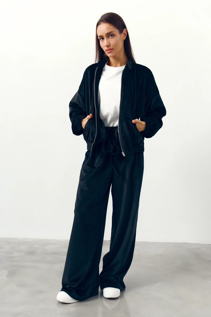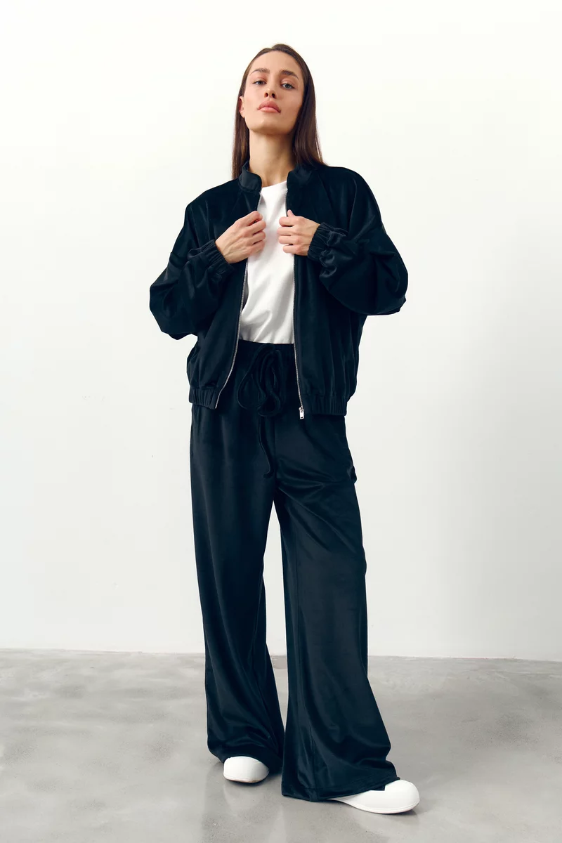 Комплект из приятного к телу бархата включает в себя бомбер с заниженной линией плеча и штаны свободного прямого кроя. Бомбер застегивается на молнию, есть боковые карманы. Брюки с высокой посадкой и поясом с завязкой, низ на затяжке позволяет регулировать ширину штанов. Благодаря своей универсальности, бомбер и штаны можно носить как в комплекте, так и по отдельности
