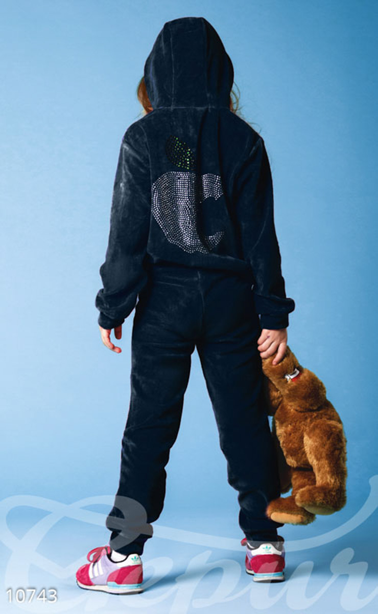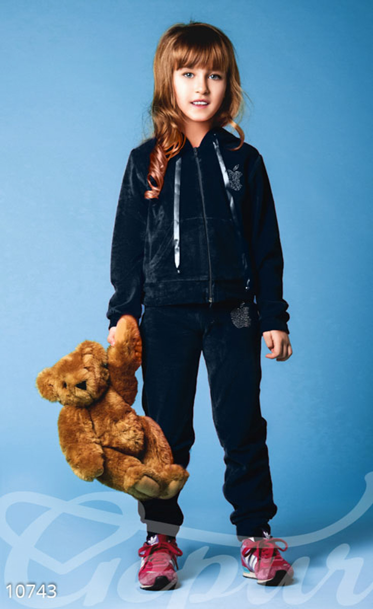 Детский спортивный костюм, выполненный из мягкого велюра: куртка на молнии с капюшоном и двумя карманами по бокам, брюки средней посадки с шелковыми завязками на поясе.