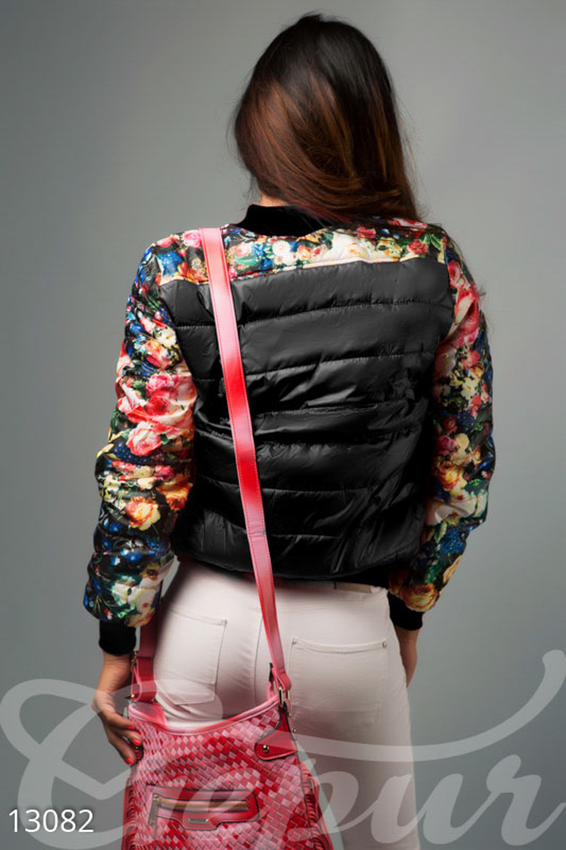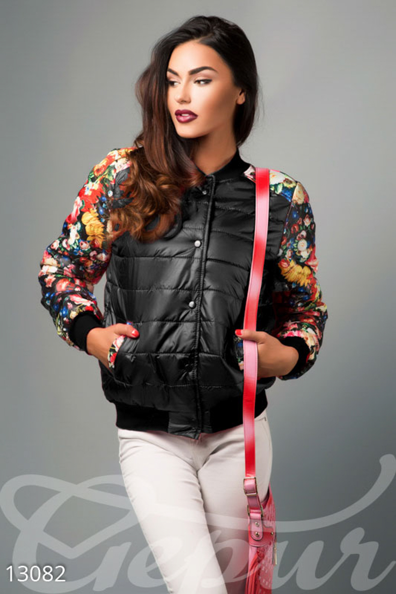Модный стеганный бомбер идеально дополнит образ в спортивном или повседневном стиле. Рукава и плечи украшены модным цветочным принтом. Два карманчика по бокам, в которые вы можете положить все необходимые вещи. Застегивается на черные кнопки. Эта модель абсолютно невесомая, но непременно согреет вас в осеннюю непогоду.