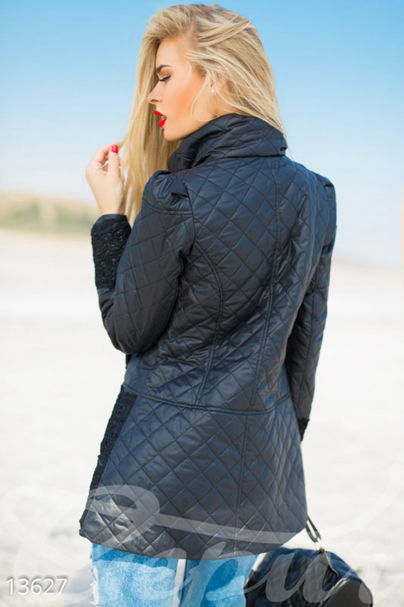 Стильная демисезонная куртка-трапеция, выполненная из стеганой плащевой ткани: широкий воротник-стойка, два удобных кармана по бокам, длинный рукав-фонарик и пришивной подол, украшенные фигурным кружевом в тон.
