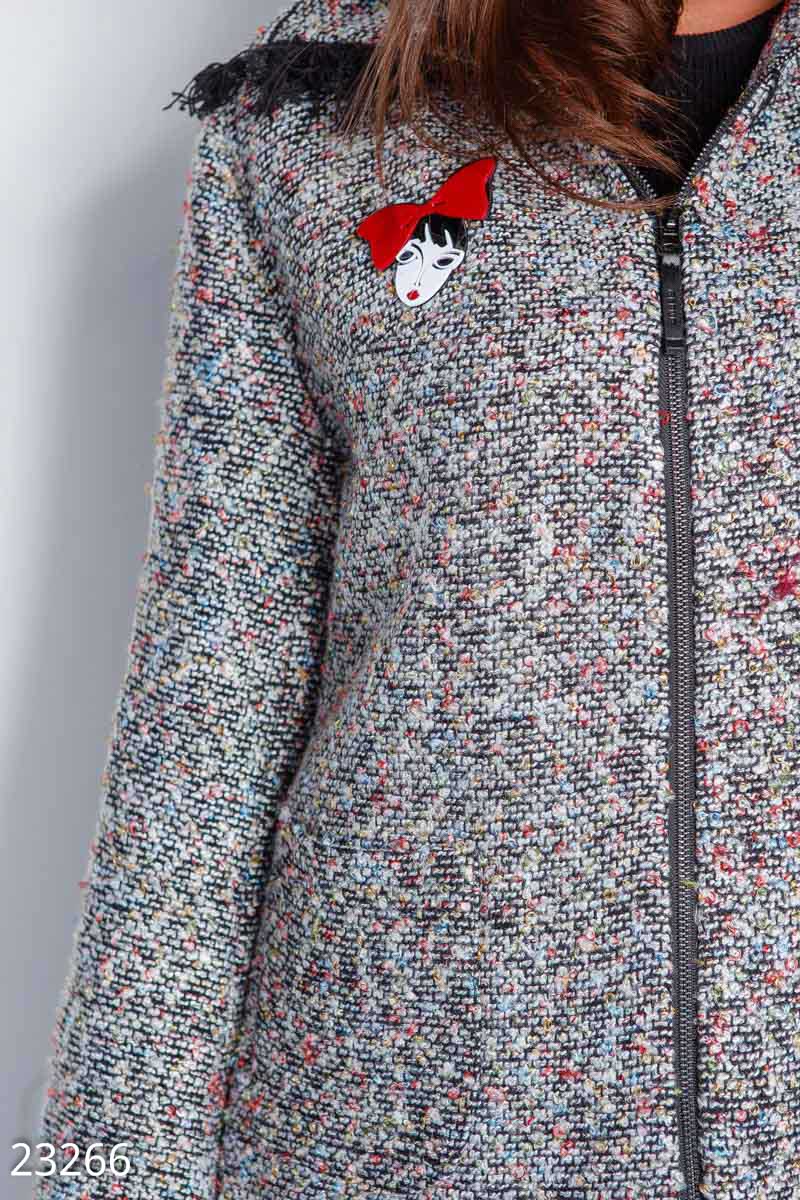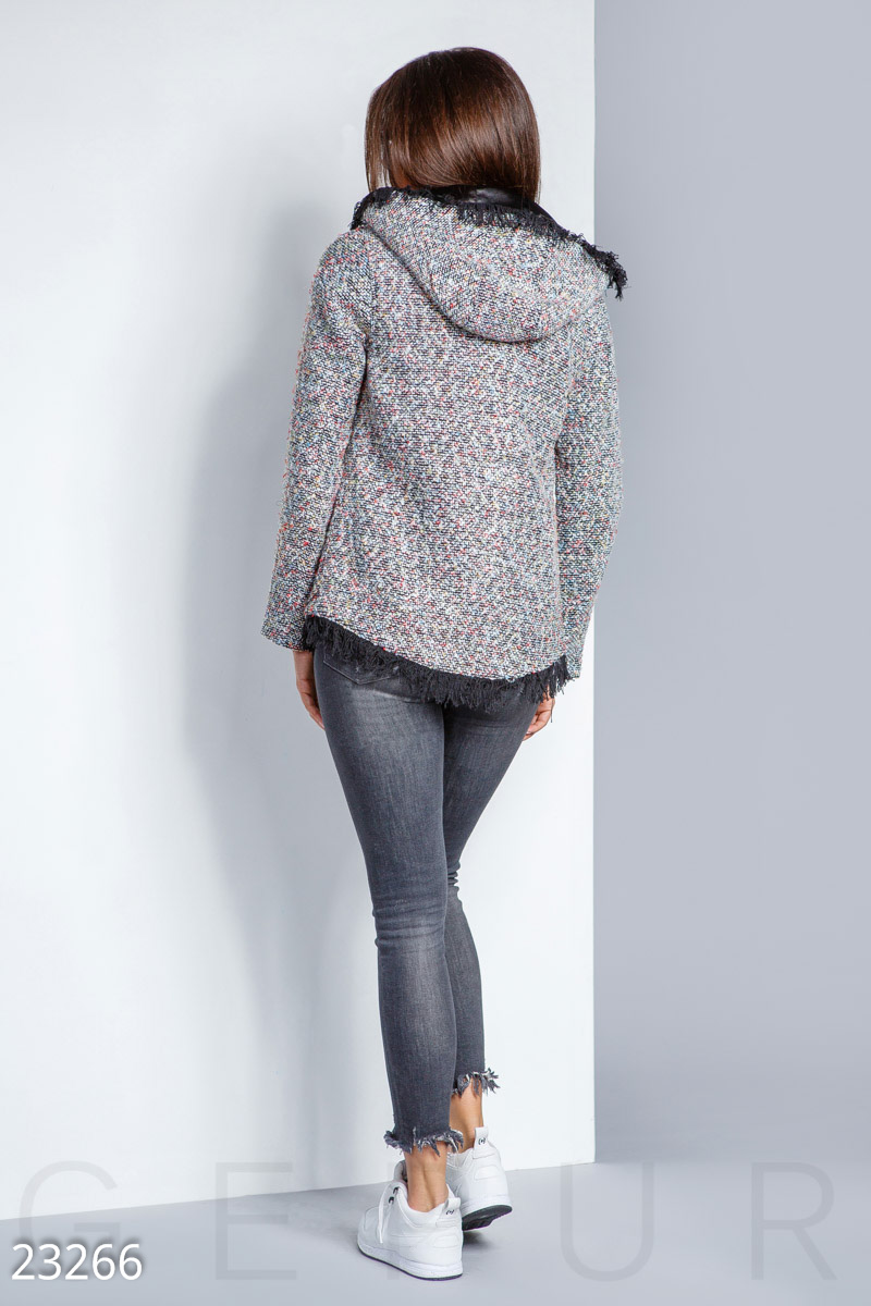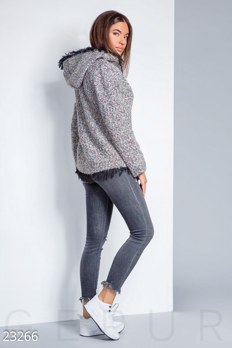 Стильная куртка из буклированной ткани: удобный капюшон, два накладных кармана, закругленный подол и отделка бахромой. В комплект входит съемный пластиковый значок.