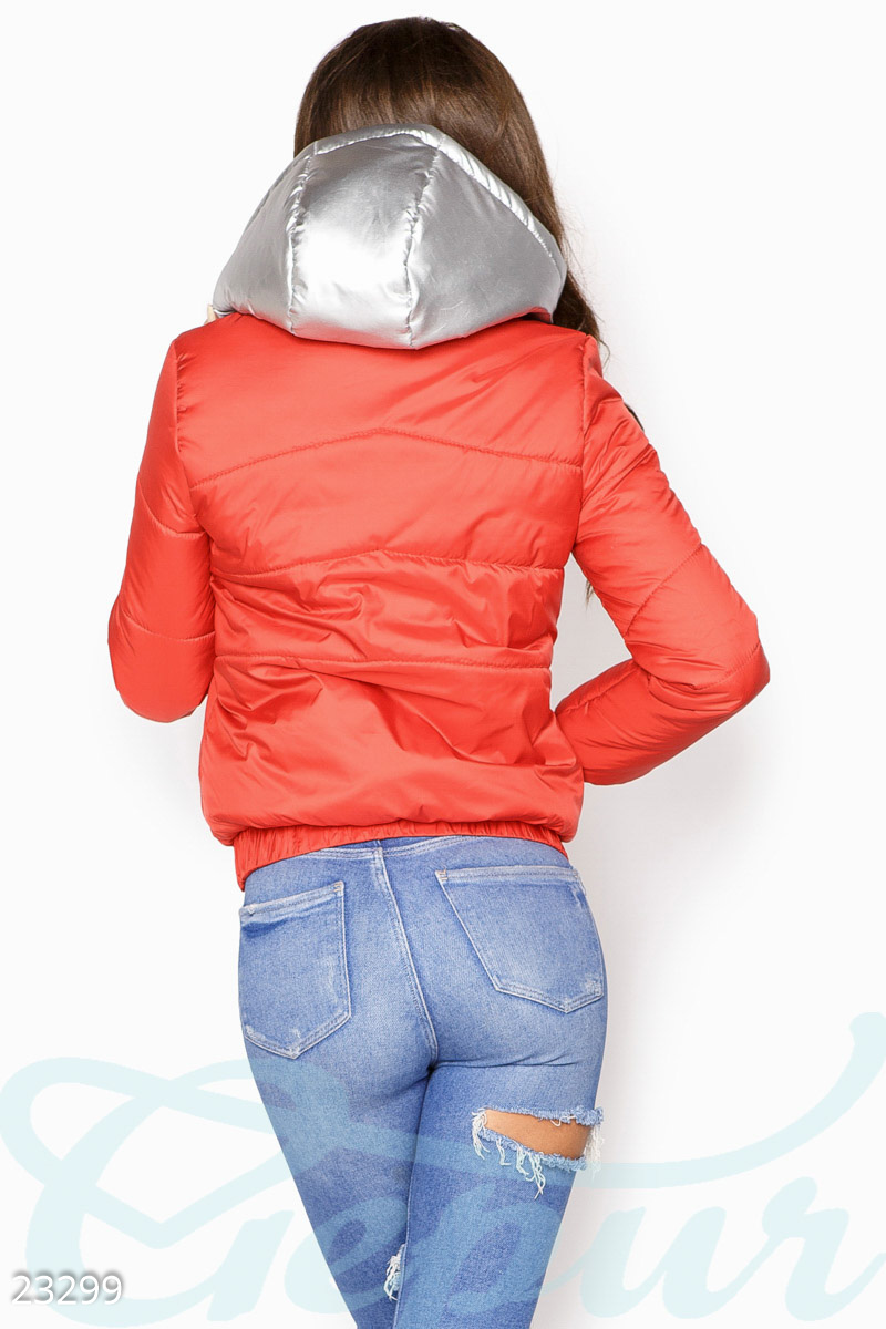 Короткая демисезонная куртка с контрастным капюшоном, двумя карманами по бокам и эластичными манжетами.