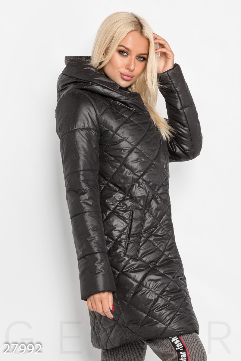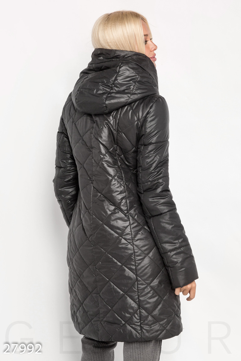 Утепленное стеганое женское пальто с пришивным капюшоном, асимметричной застежкой и двумя карманами по бокам.