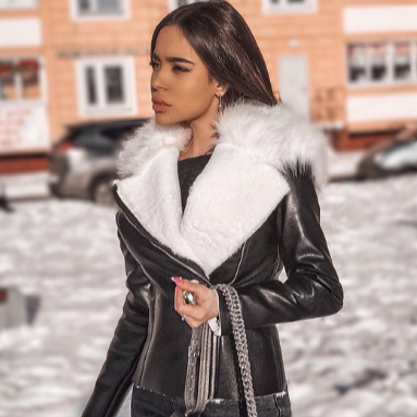 Двухцветная женская куртка-авиатор с меховой отделкой, выполненная из дубленой эко-кожи premium класса: контрастный воротник с лацканами, длинный рукав без манжет и асимметричная застежка на молнию.