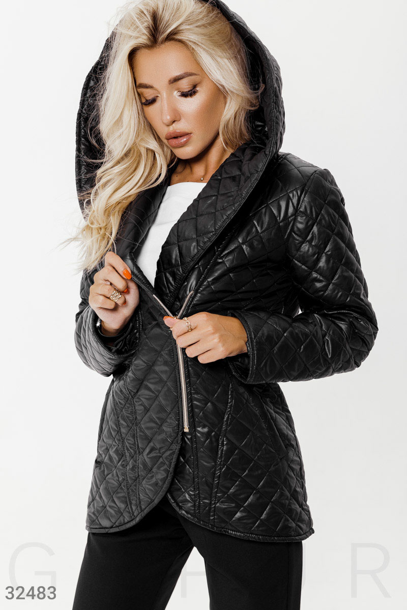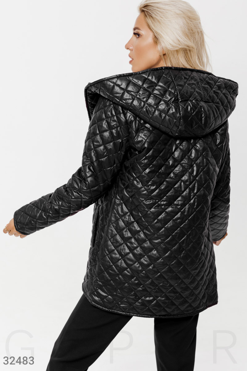 Удлиненная стеганая куртка: объемный неотстегивающийся капюшон, шалевый воротник, длинный рукав, боковая планка с молнией, два прорезных карманаи удлиненная спинка.