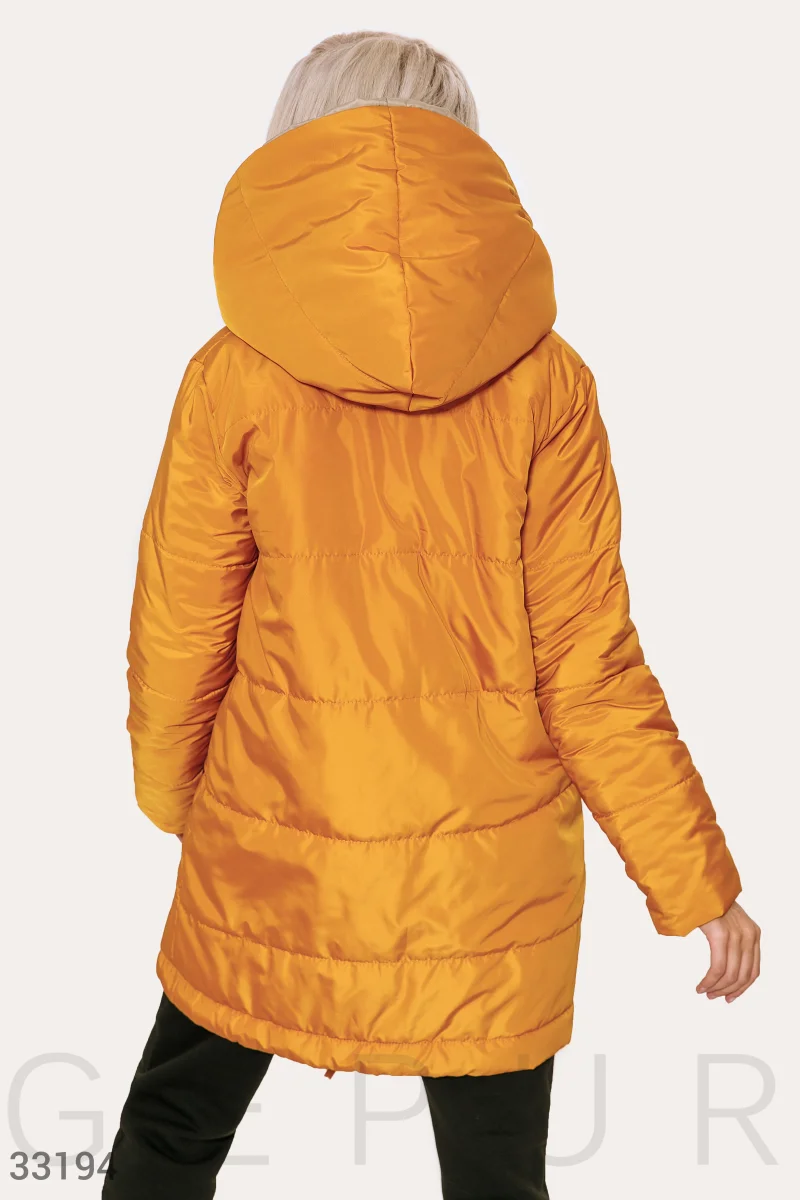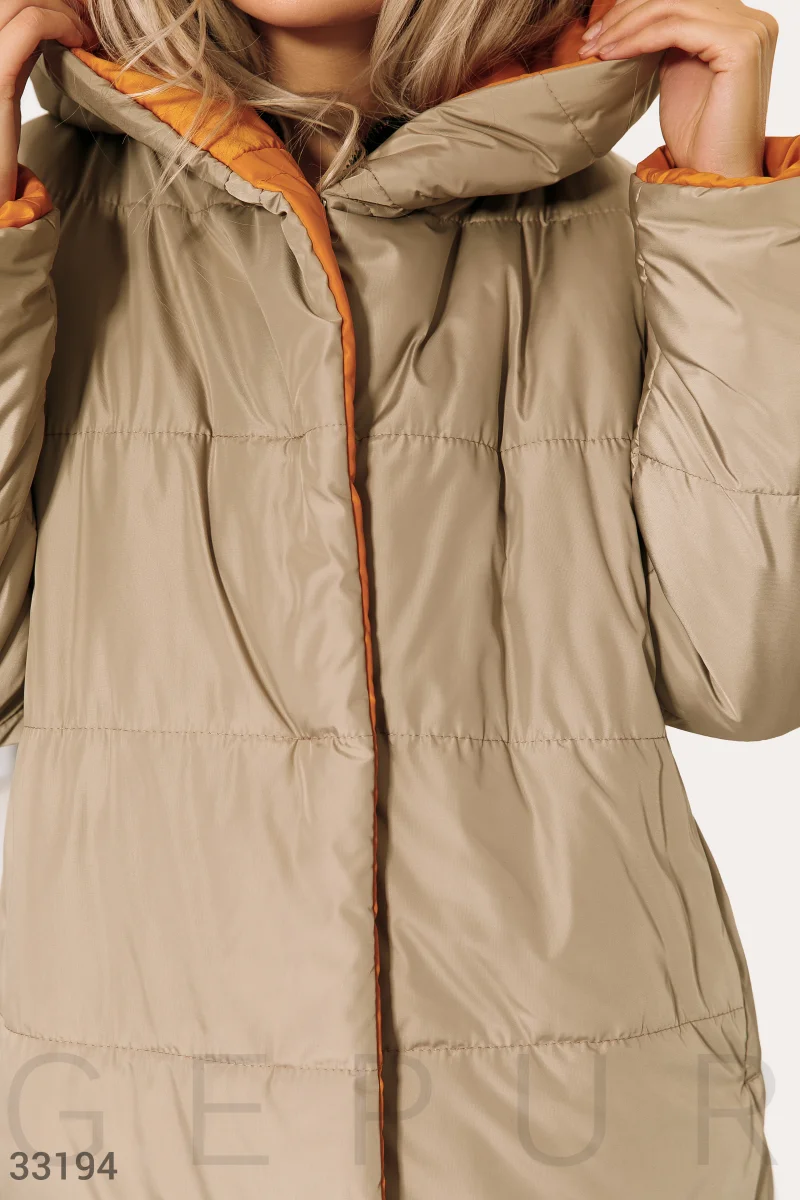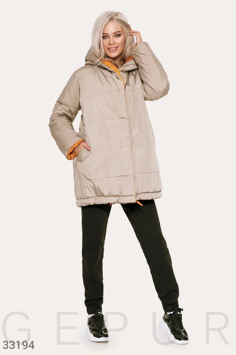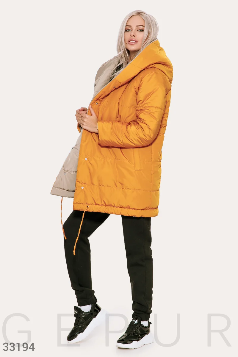 Двусторонняя объемная куртка: не отстегивающийся капюшон, длинный рукав, планка с металлическими кнопками спереди и подол на завязках.