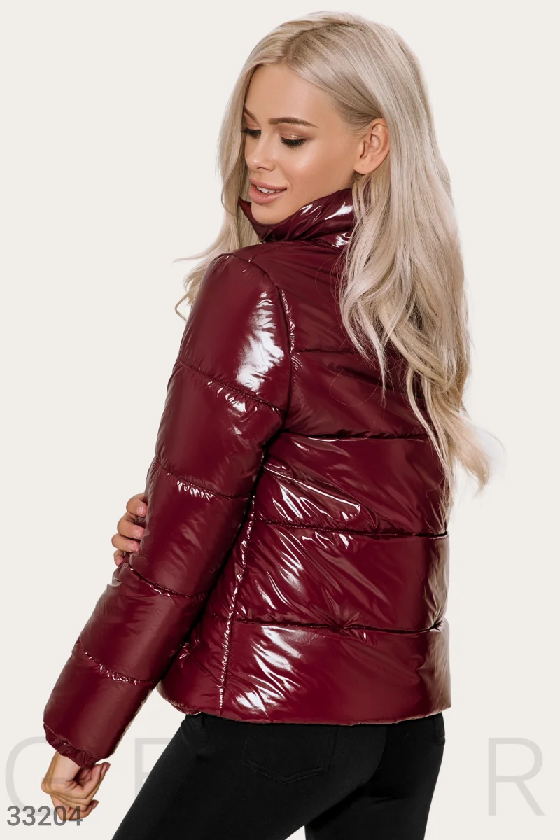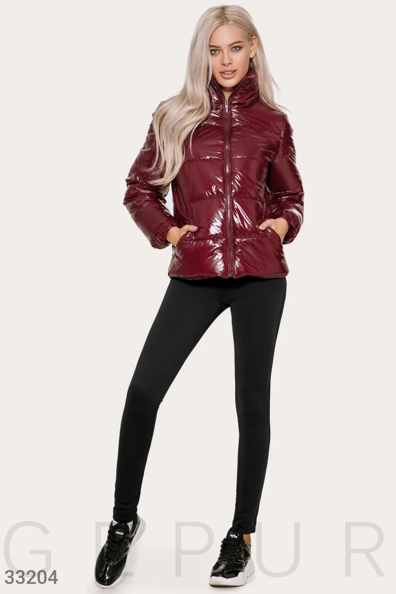 Стеганая утепленная куртка бордового цвета с воротником стойкой, длинным рукавом на эластичной манжете, два прорезных кармана по бокам.
