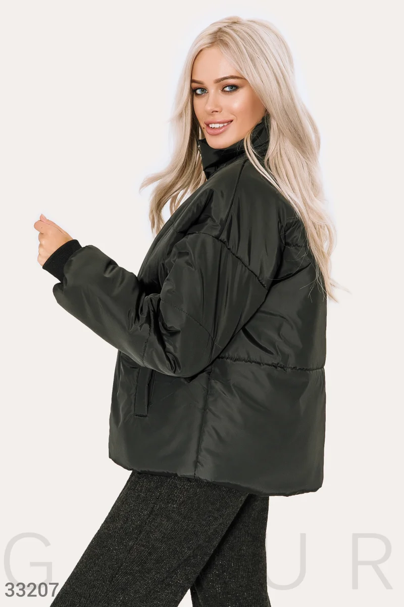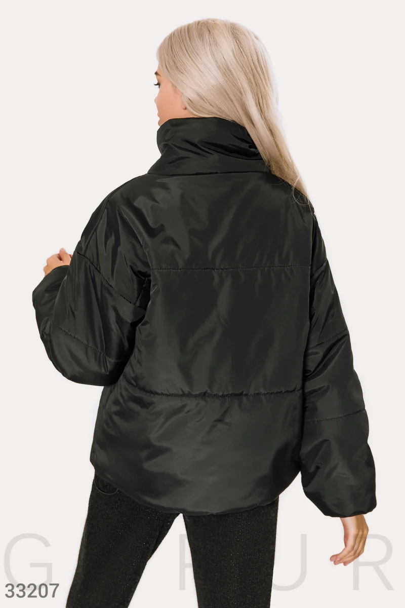 Демисезонная черная куртка-oversize: воротник стойка, длинный рукав с эластичными трикотажными манжетами, два прорезных кармана и затяжки на подоле.
