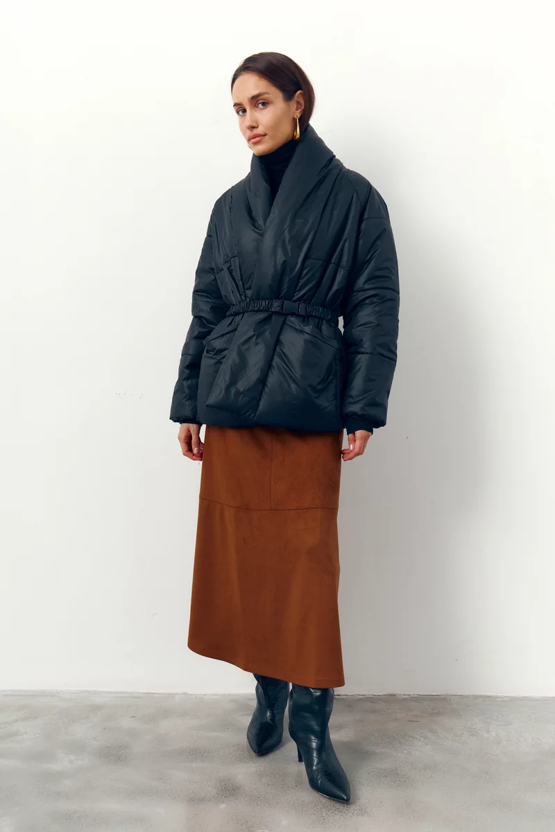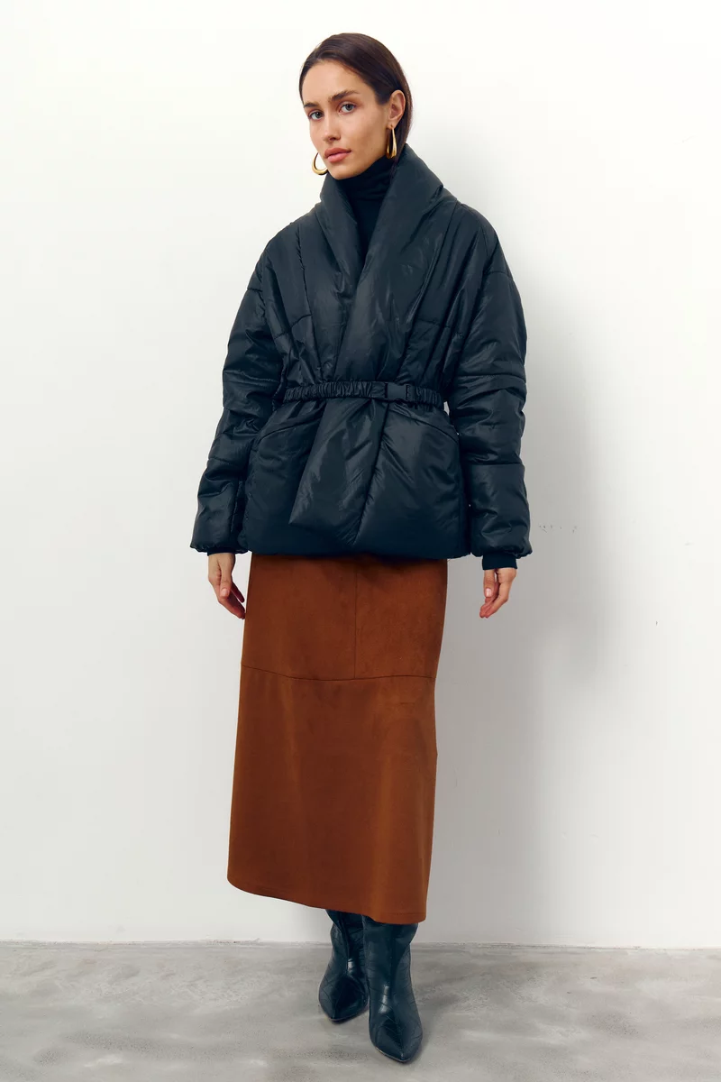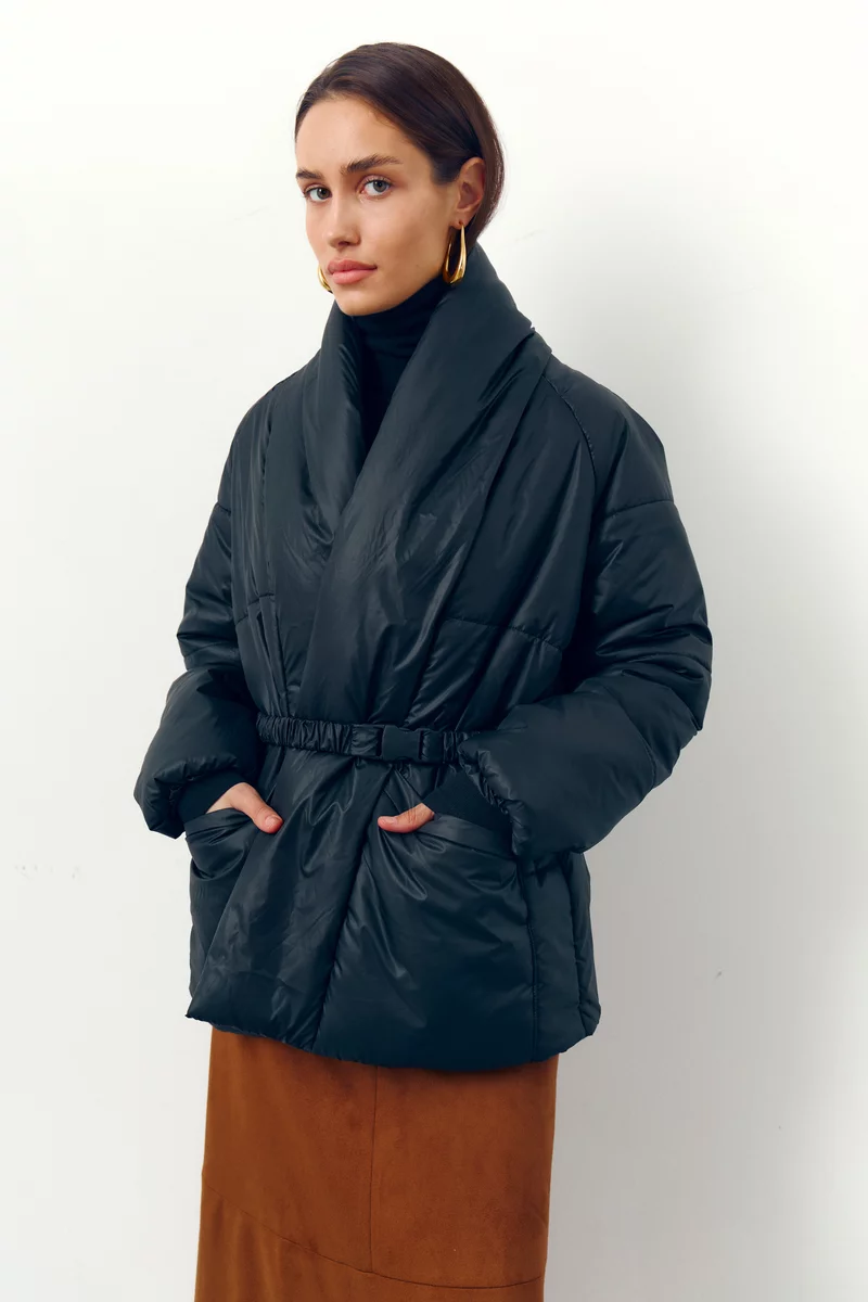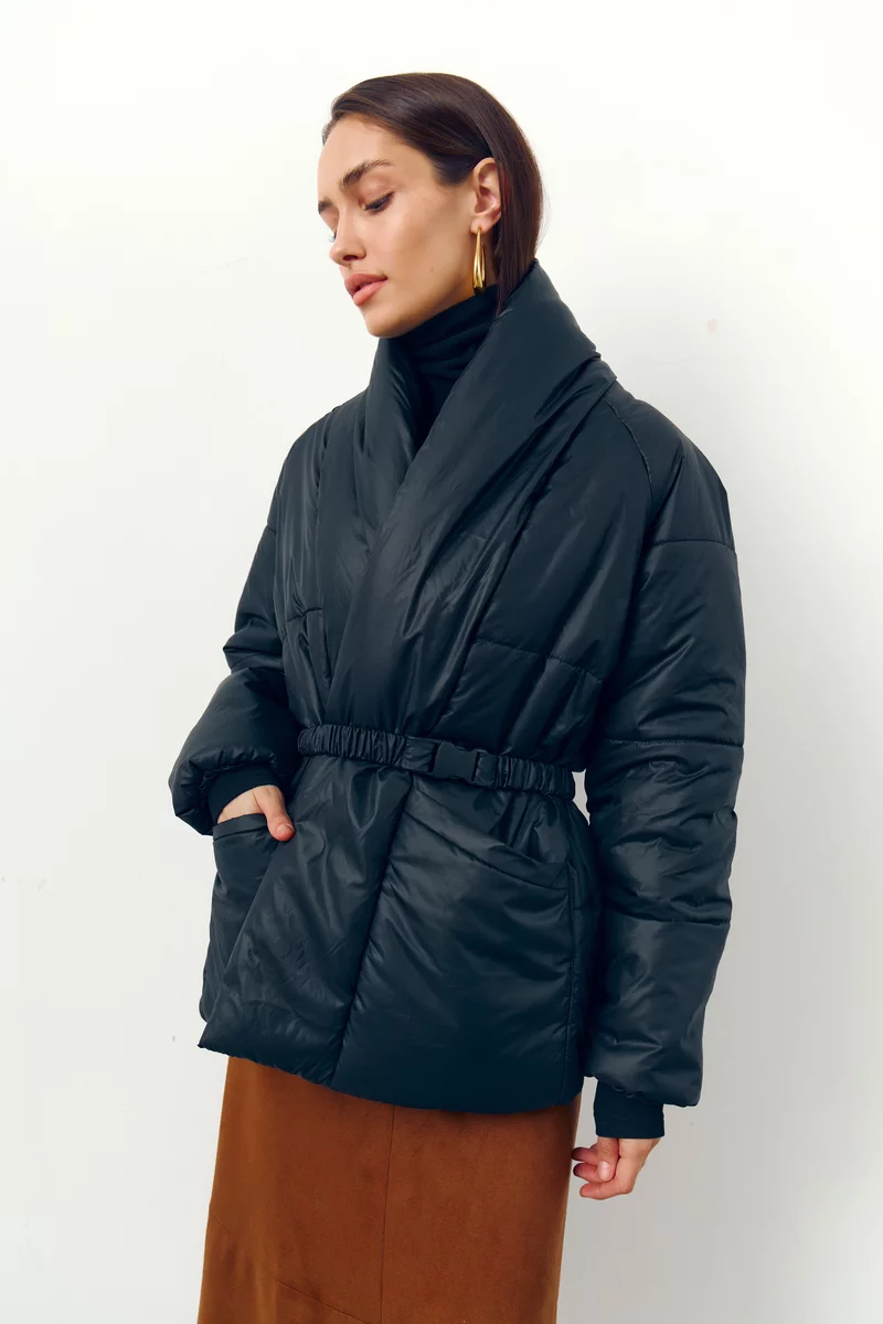 Пуховик-кимоно прямого кроя – базовая модель на каждый день. Пояс на резинке в комплекте. Пуховик с заниженной линией плеча и боковыми карманами. Наполнитель – синтепон