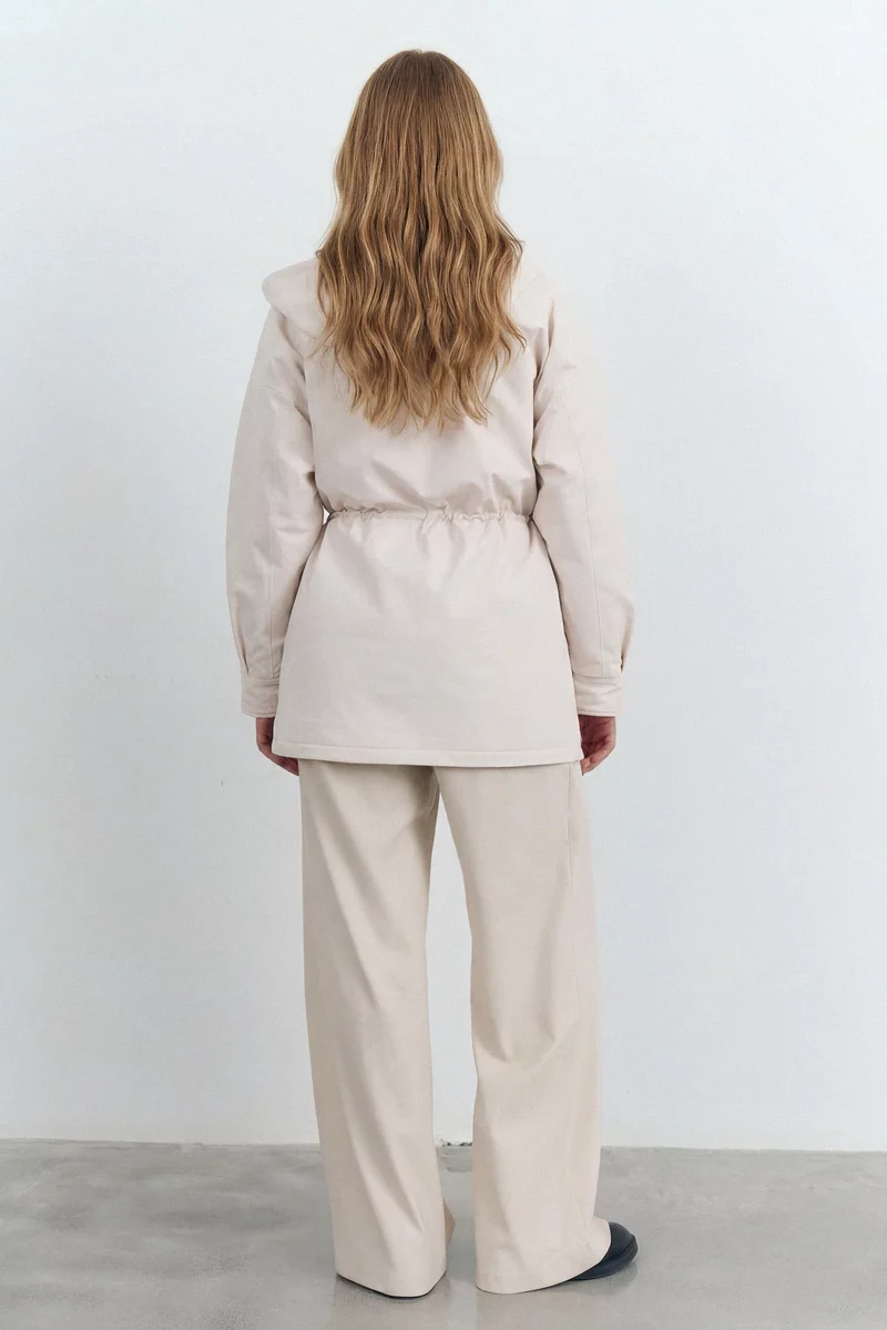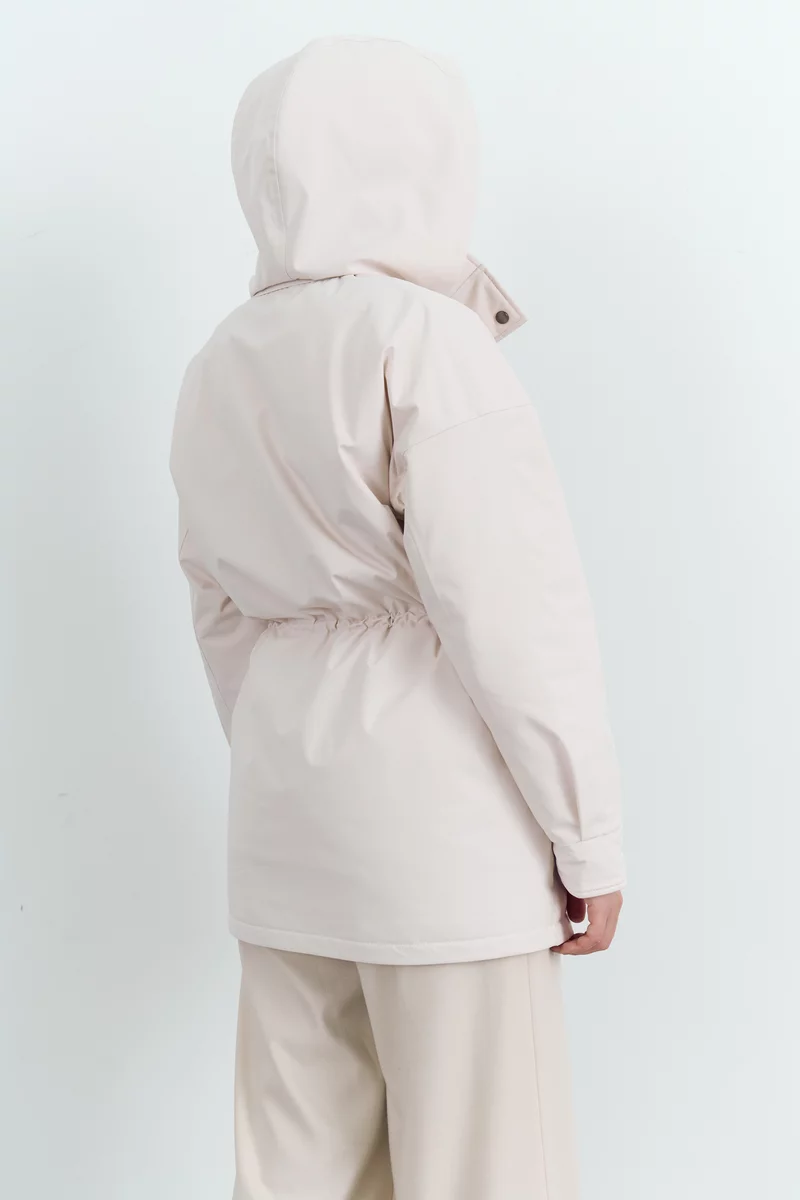 Куртку-парку выполнили из матовой плащевки. Модель со съемным капюшоном, талия регулируется завязками. Боковые карманы с клапанами на кнопках. Застёгивается на скрытую молнию и кнопки. На подкладке
