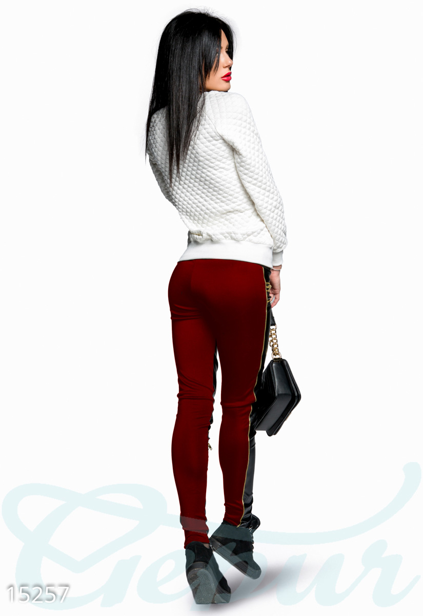 Необычные и стильные леггинсы украшены декоративными змейками с бегунками. Модель двустороння - передняя часть выполнена из экокожи, задняя - из дайвинга. Леггинсы с низкой посадкой. На талии широкий пояс на резинке. Эту модель можно сочетать с блузами, свитерами, кофтами в стиле casual.