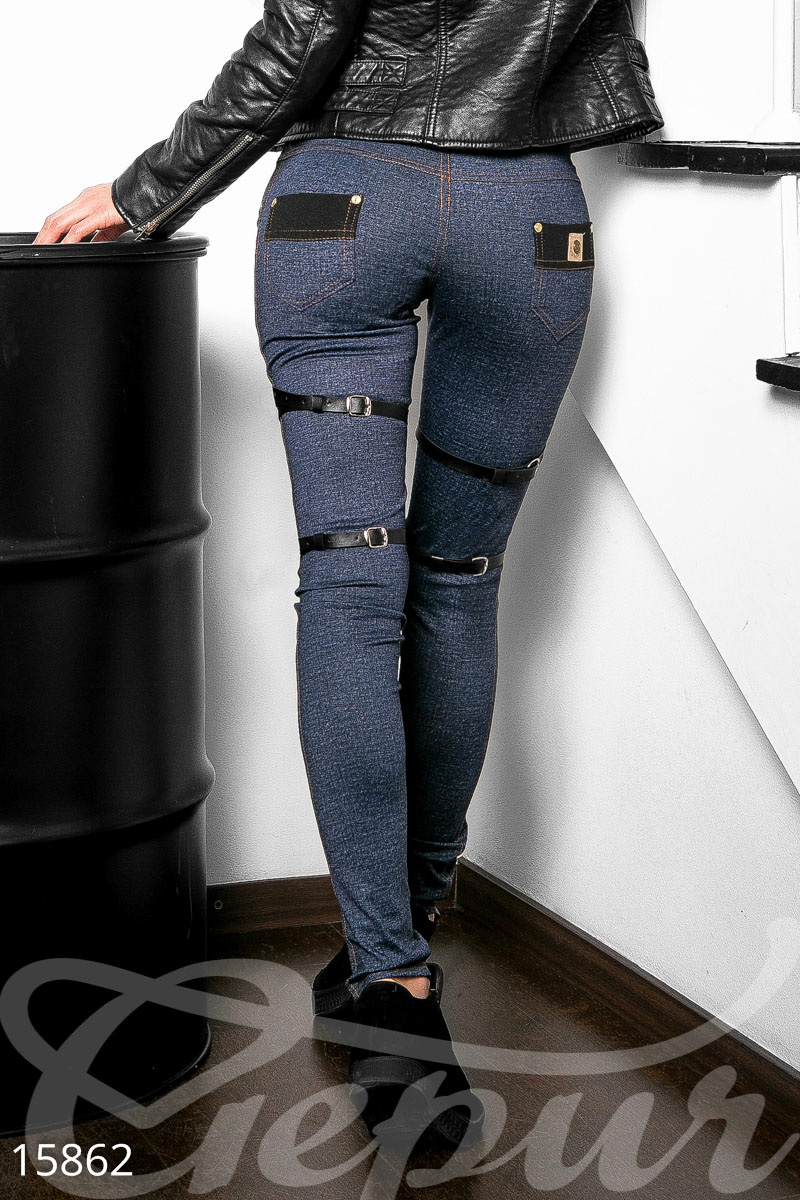 Эластичные джеггинсы средней посадки, украшенные контрастной строчкой: средняя посадка, два небольших накладных кармана и съемная портупея из эко-кожи.