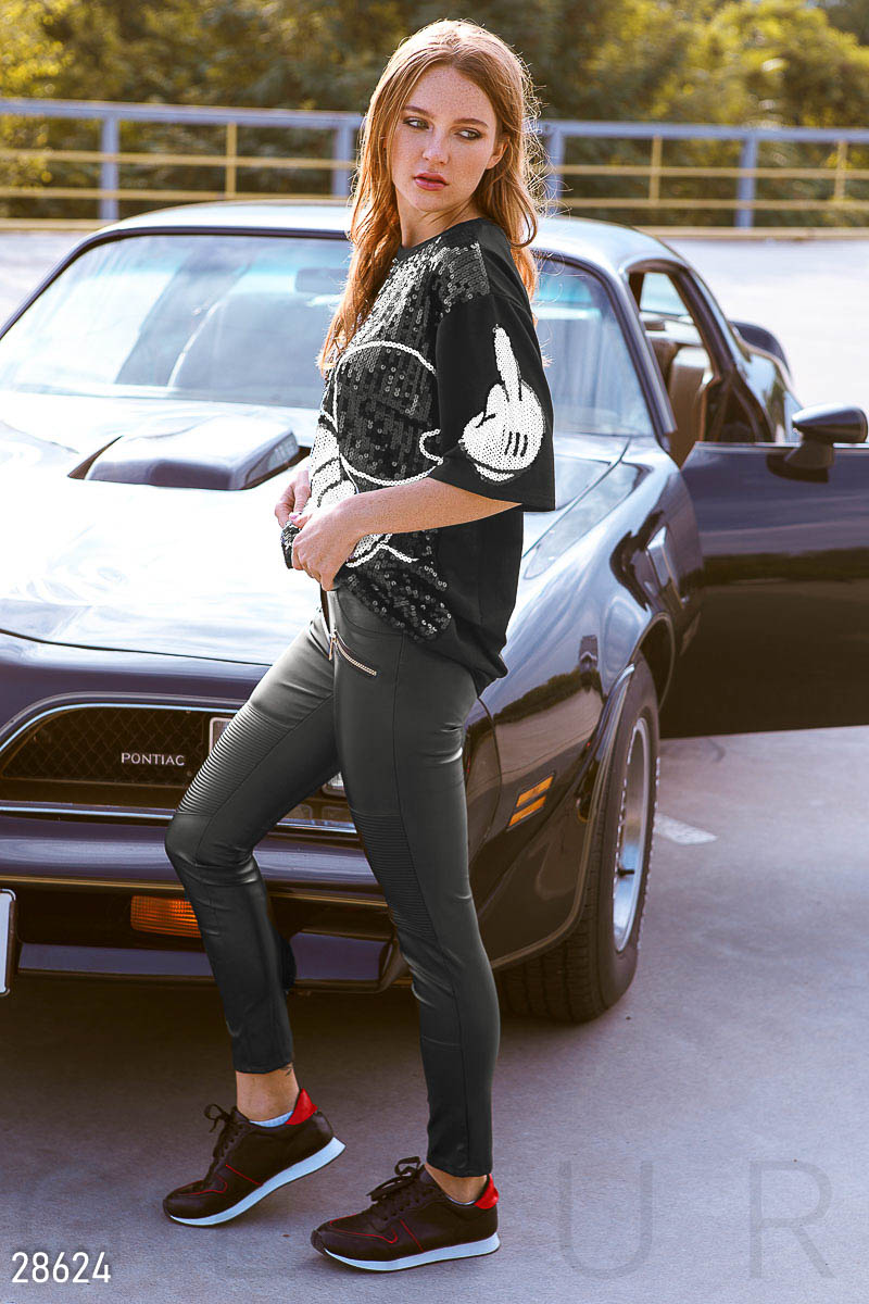Актуальные леггинсы средней посадки, выполненные из мягкой эко-кожи на трикотажной основе: пришивной пояс с петлями, карманы-обманки на молнии и вставки на коленях из стеганого текстиля с напылением.