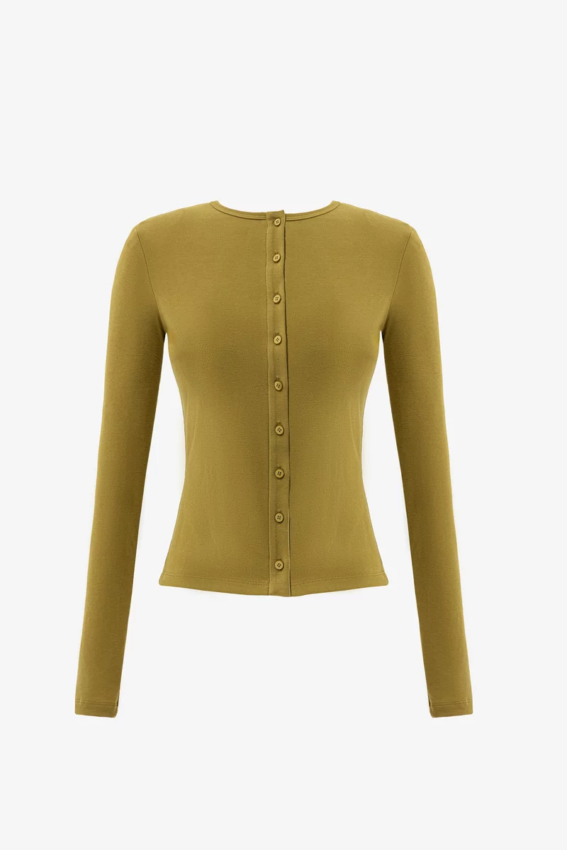 Мягкий и приятный к телу лонгслив из трикотажа. Длинный облегающий рукав. Застёгивается на пуговицы