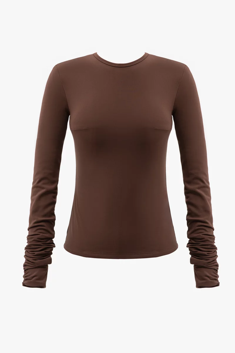 Лонгслив из мягкого трикотажа на тонком, при этом плотном флисе – ткань отлично сохраняет тепло, при этом эффектно подчеркивает фигуру и моделирует силуэт. Длинный рукав с драпировкой