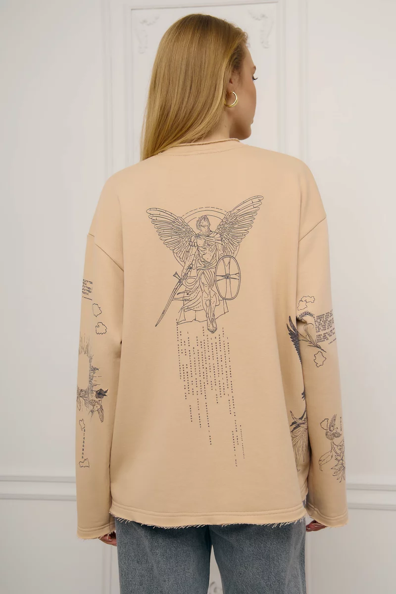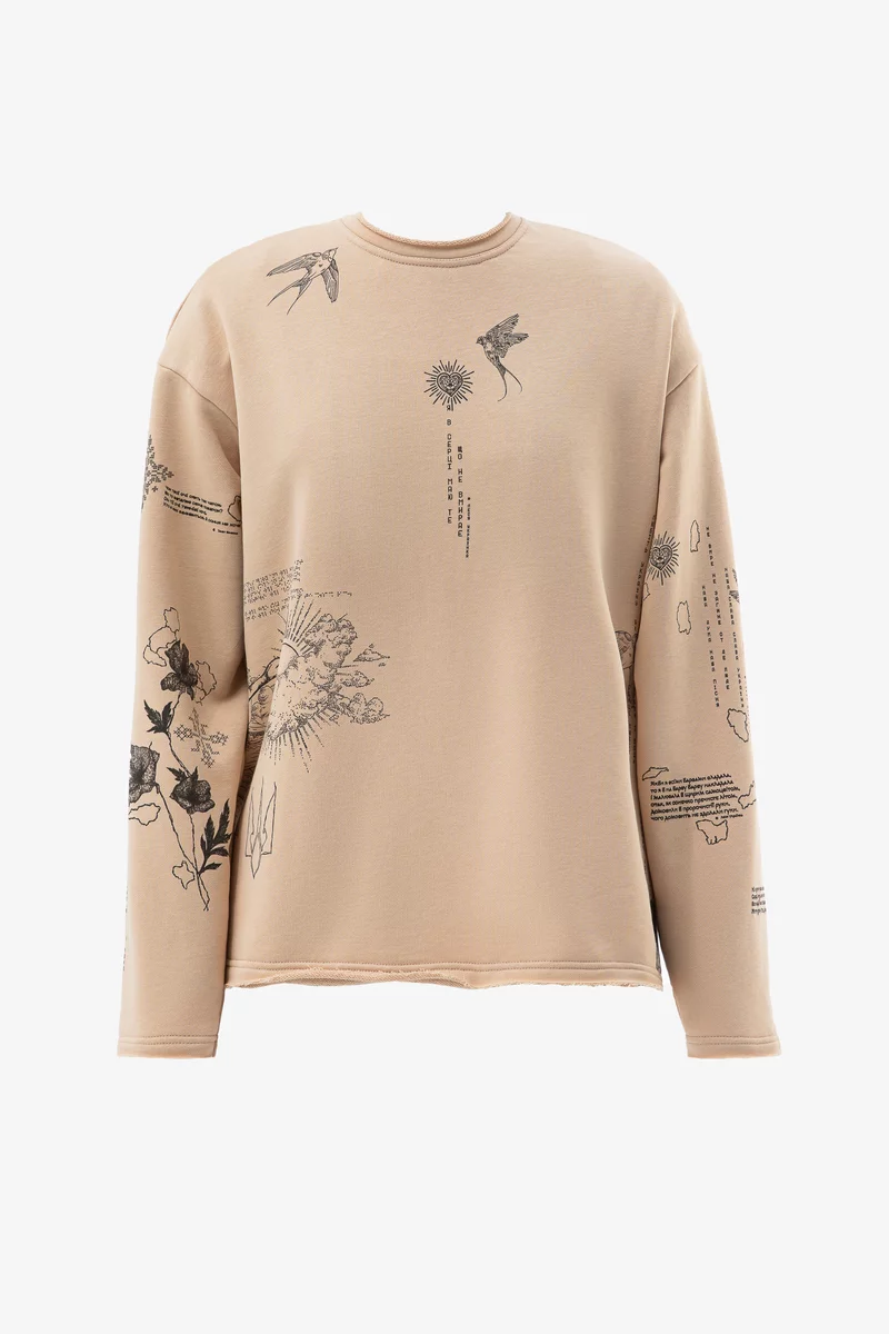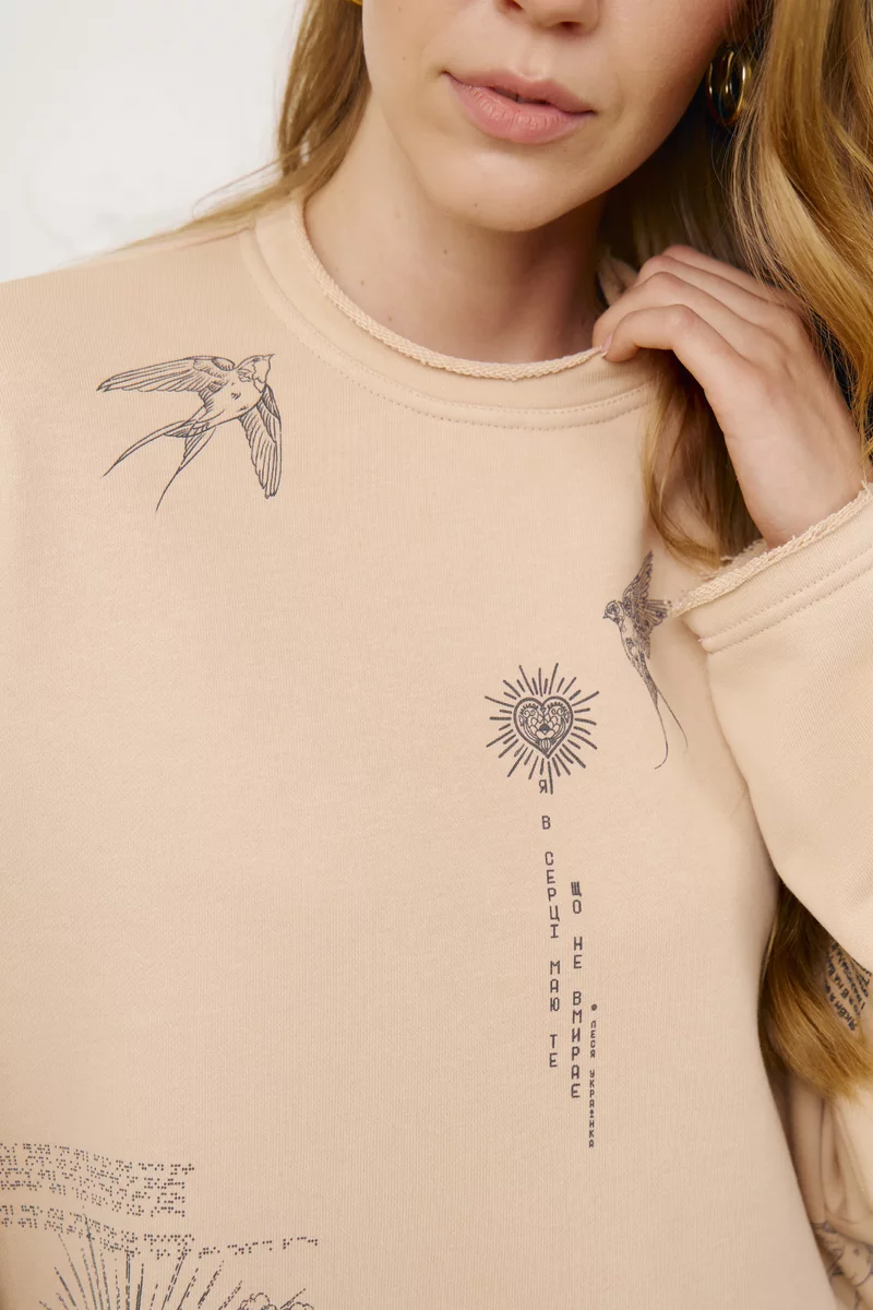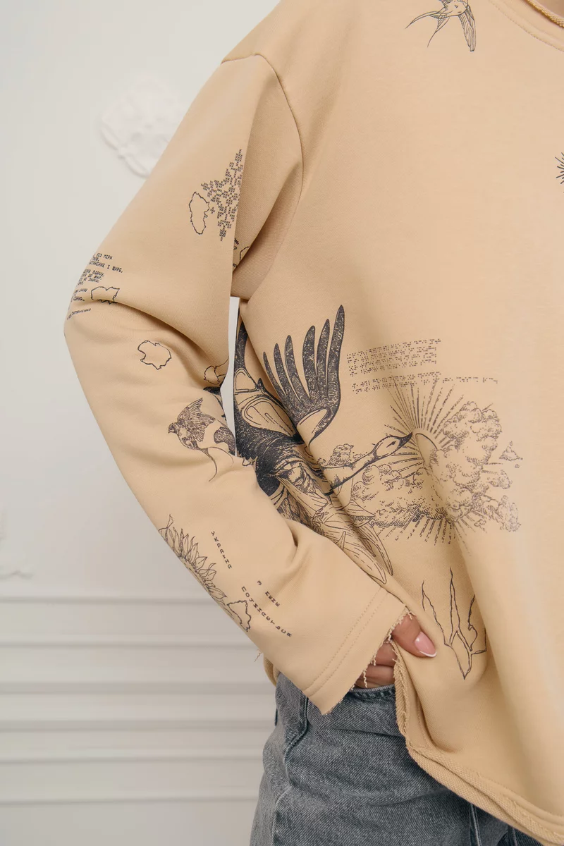 Тоненька, але тепла кофта на флісі. Цікавий ненав'язливий принт. Оверсайз, якшо брати м-л. Підійде навіть на хl і буде виглядати вільно. Якість крута, як завжди в Gepur.