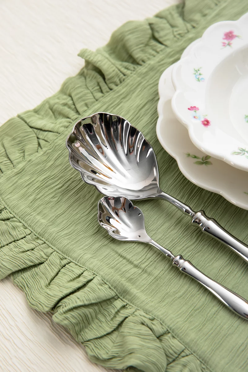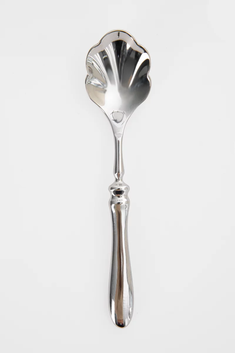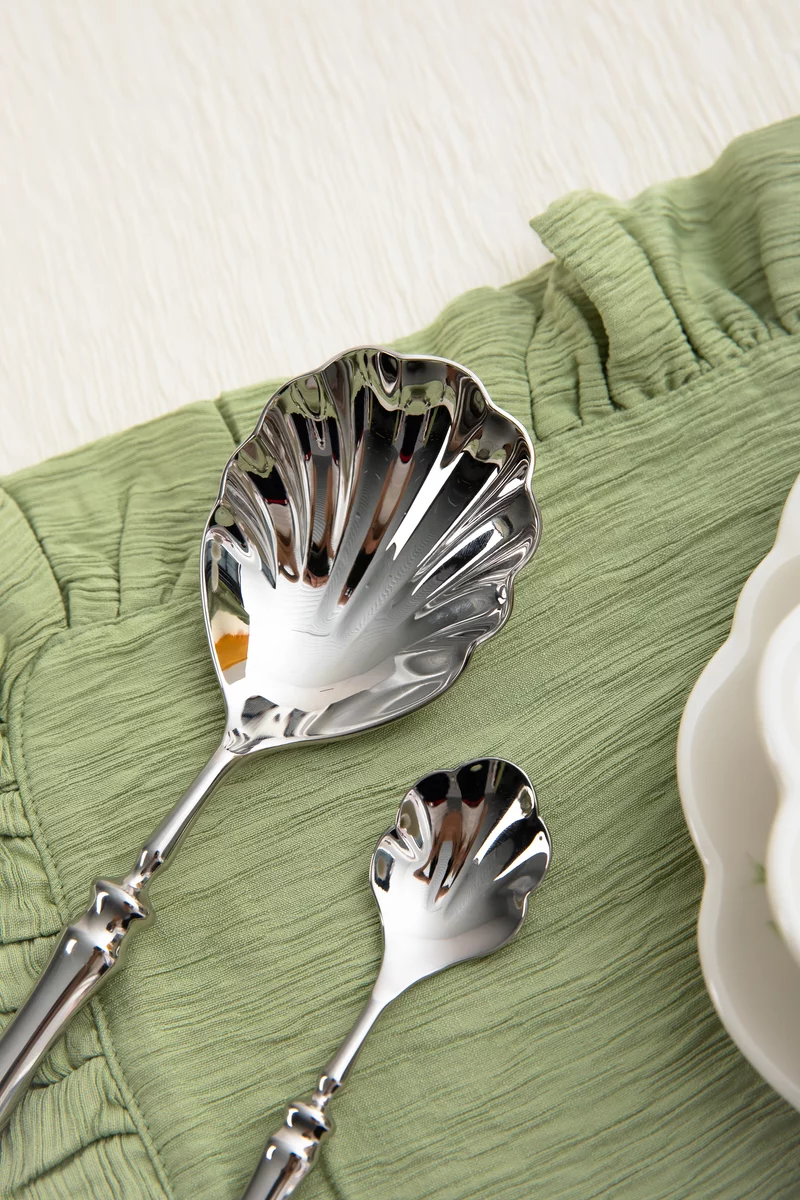 Дессертная сервировочная ложка из нержавеющей стали в форме ракушки. Подходит для ежедневного использования, легко моется. Классический дизайн подходит к любой посуде