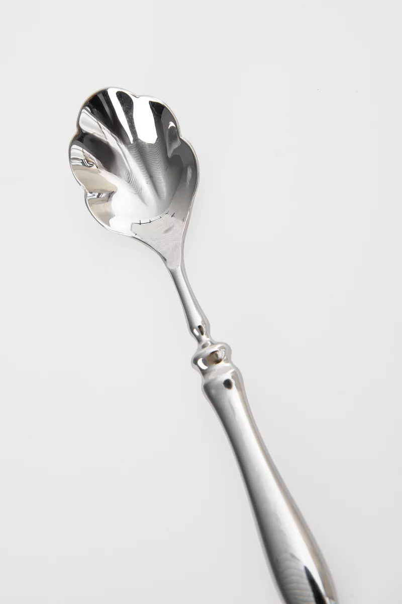 Серебристая десертная металлическая ложка в форме ракушки
