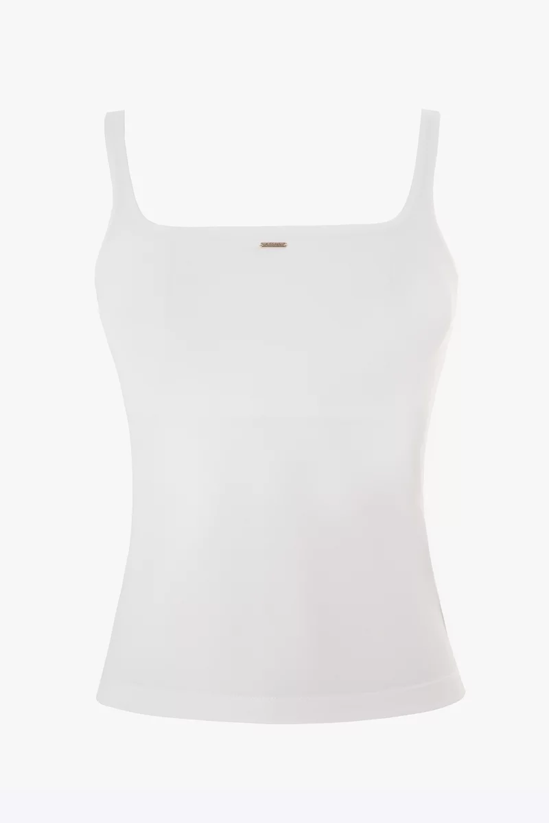 Базовый трикотажный топ на тонких бретелях. Эффектно выглядит как самостоятельно, так и как база под жакет оверсайз