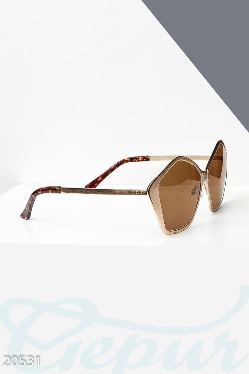 Солнцезащитные очки в металлической оправе многоугольной формы, с тонкими дужками и силиконовым носоупором. Ширина линзы: 6 см Общая ширина оправы: 14.5 см