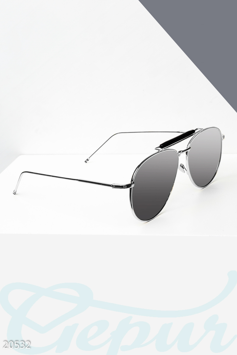 Солнцезащитные очки-авиаторы, классическая модель в металлической оправе, с тонкими дужками, металлическим носоупором и дополнительным мостиком с черным декором. Ширина линзы: 6 см Общая ширина оправы: 13.5 см
