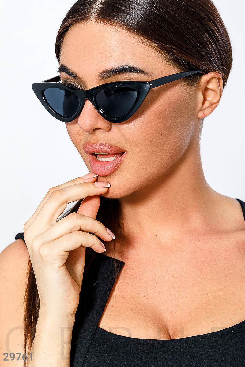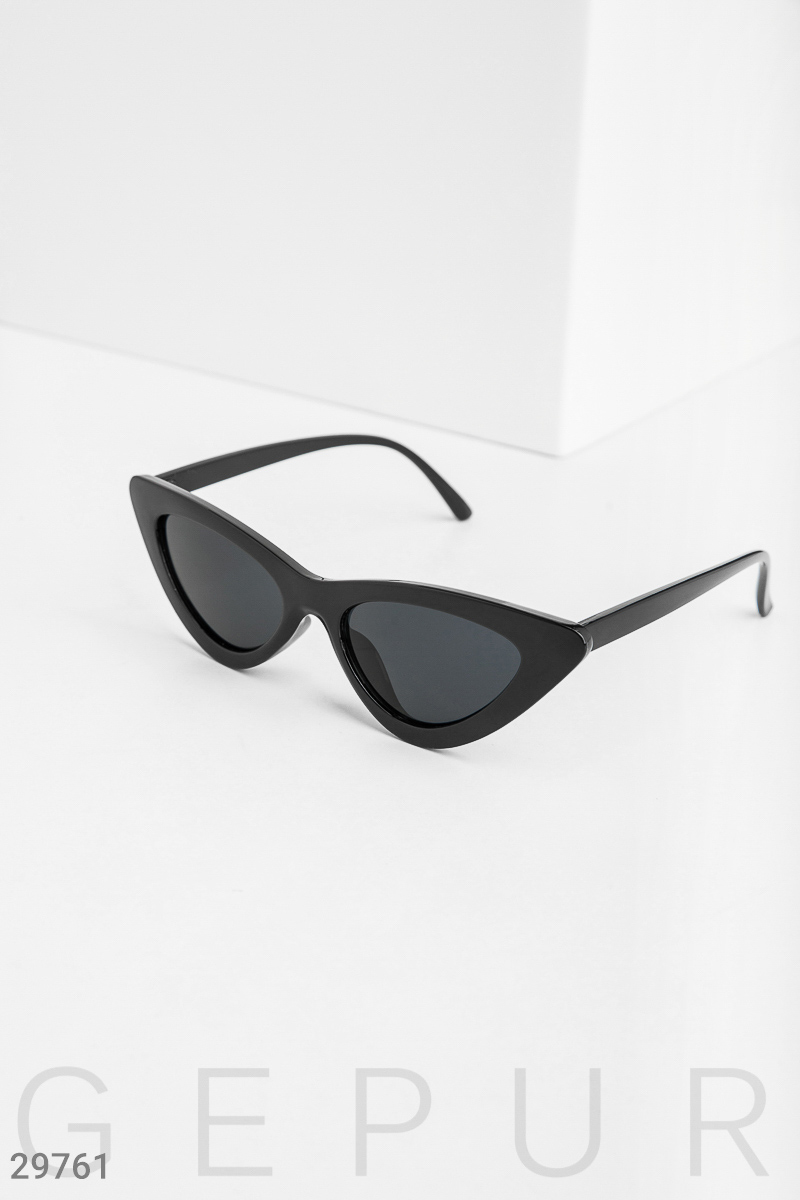 Узкие солнцезащитные очки «кошачий глаз» с яркими стеклами и удобными литыми носоупорами.