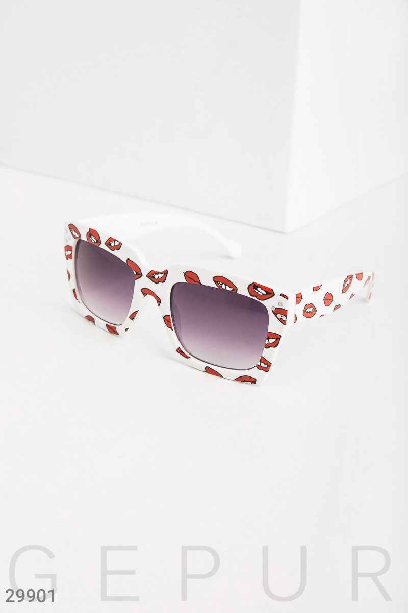 Стильные квадратные очки с затемненными стеклами в массивной пластмассовой оправе, украшенной ярким рисунком.