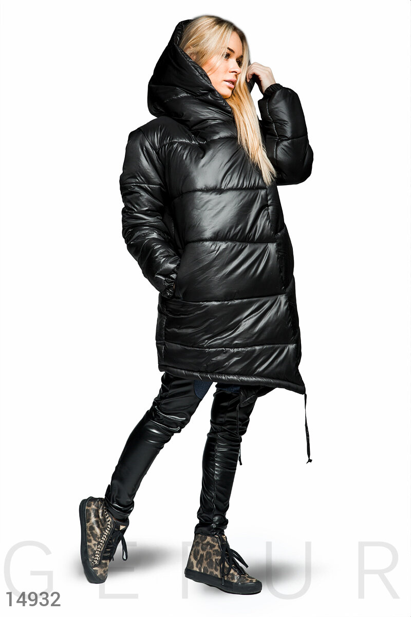 Теплое зимнее пальто-одеяло, выполненное из стеганой плащевой ткани: удобный капюшон, длинный рукав с эластичной манжетой, два небольших кармана по бокам и асимметричный подол с завязками, позволяющими самостоятельное регулировать его ширину.