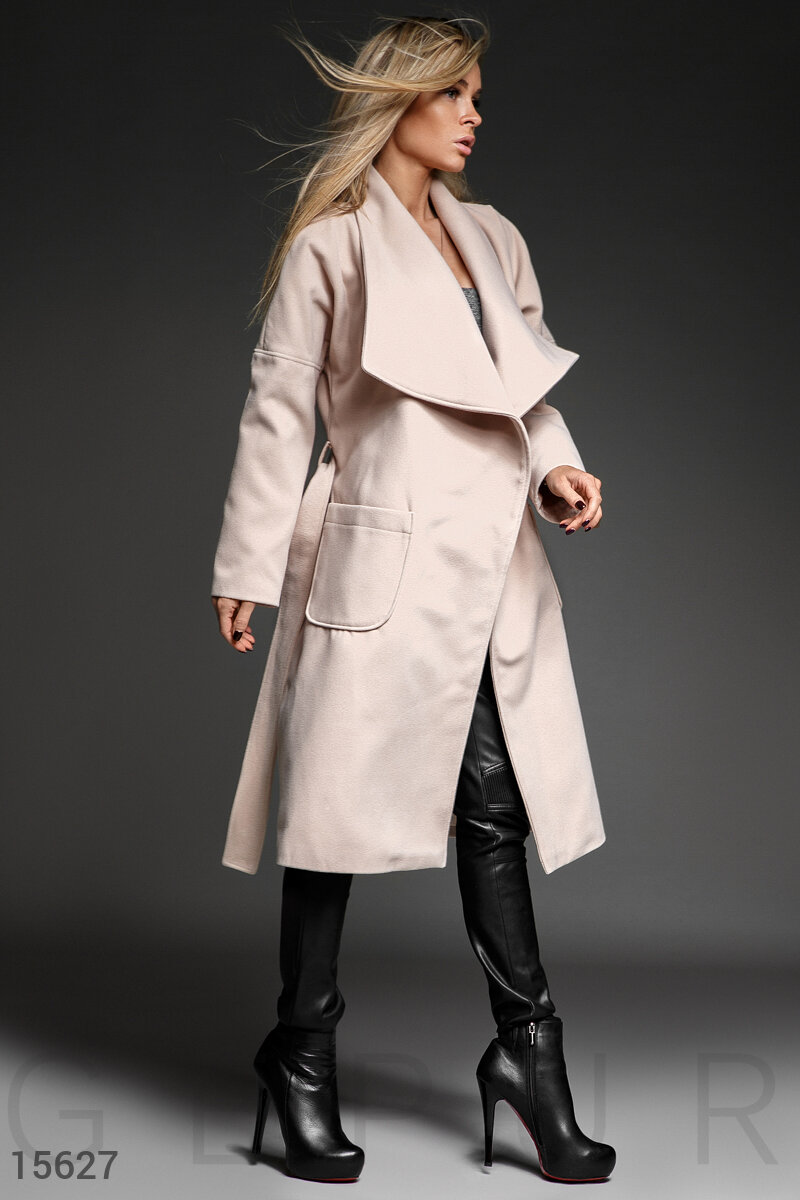 Демисезонное пальто на запáх от дизайнеров Gepur, выполненное из мягкого эко-кашемира: объемные лацканы, заниженная линия плеча, два накладных кармана по бокам и съемный пояс в петлях-шлевках.