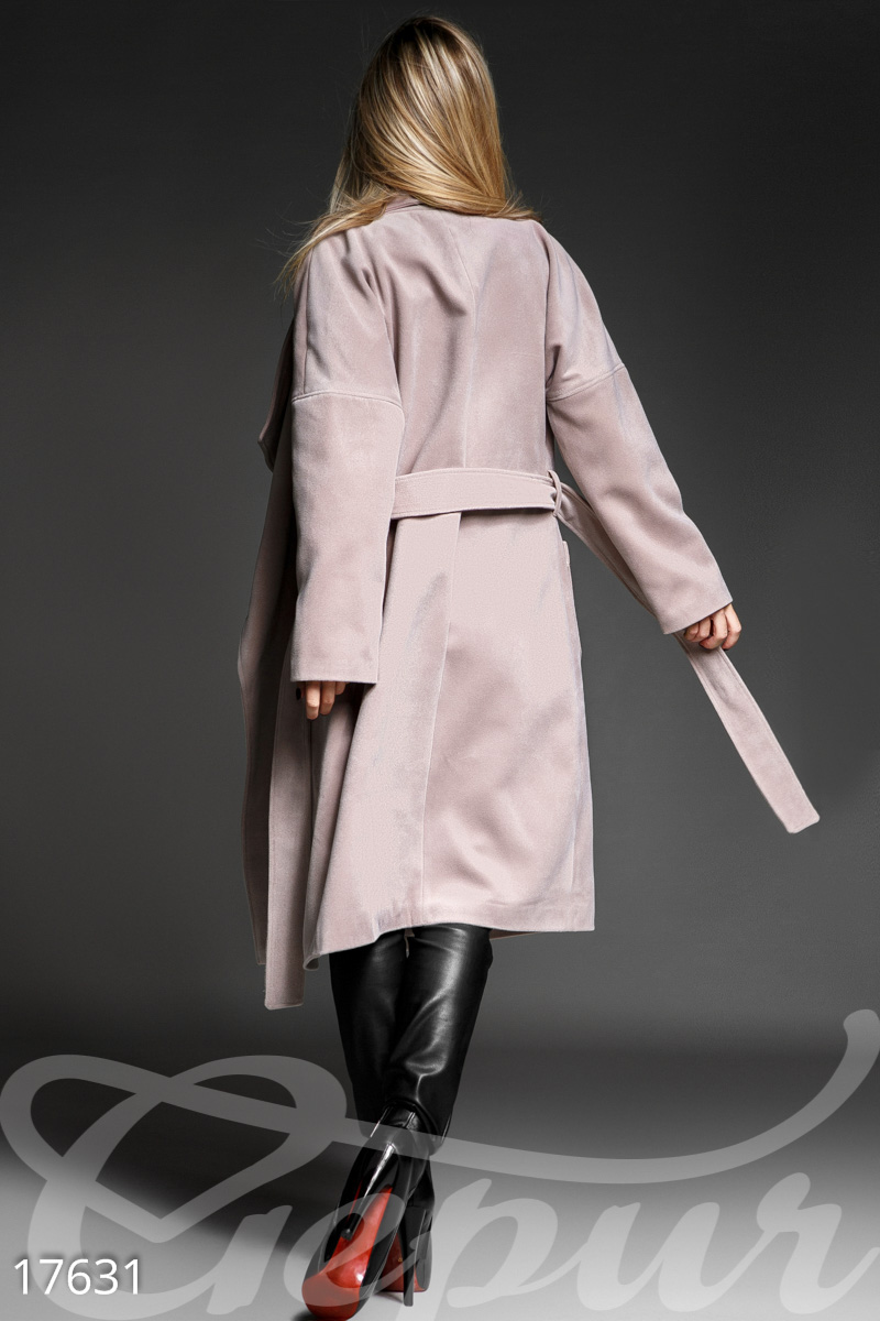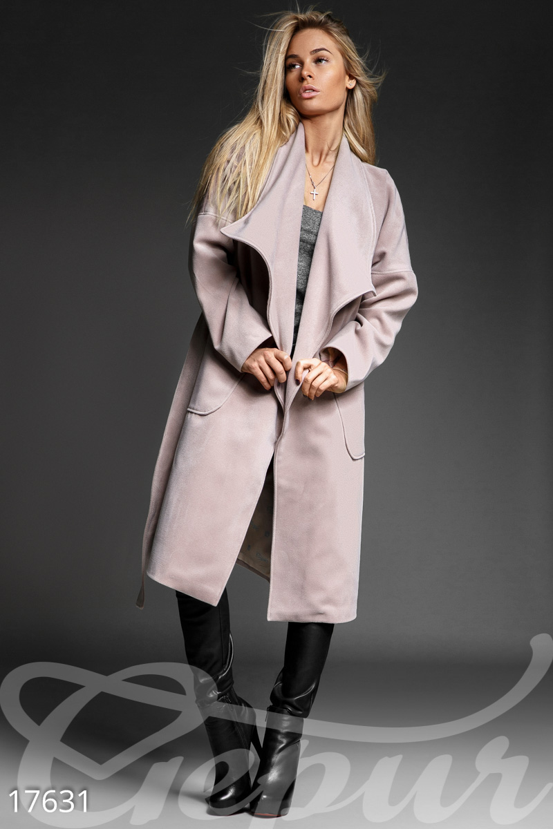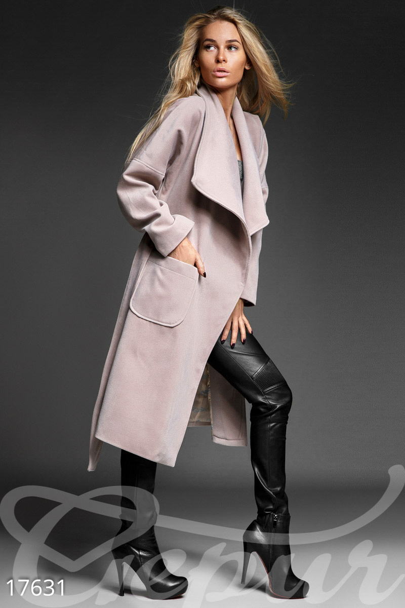 Демисезонное пальто на запáх от дизайнеров Gepur, выполненное из мягкого эко-кашемира: объемные лацканы, заниженная линия плеча, два накладных кармана по бокам и съемный пояс в петлях-шлевках.