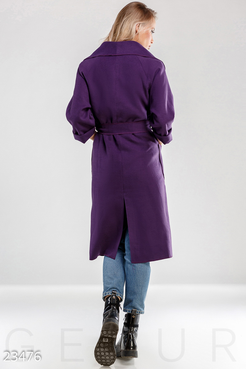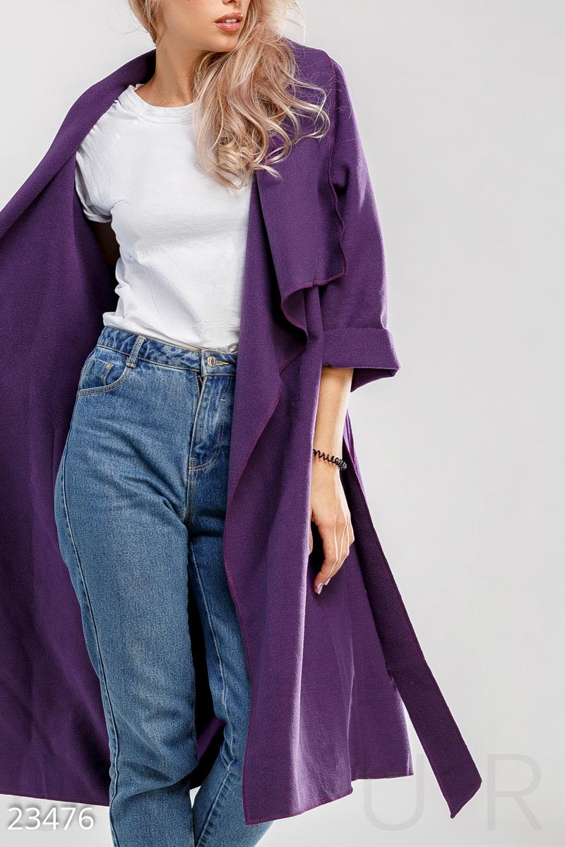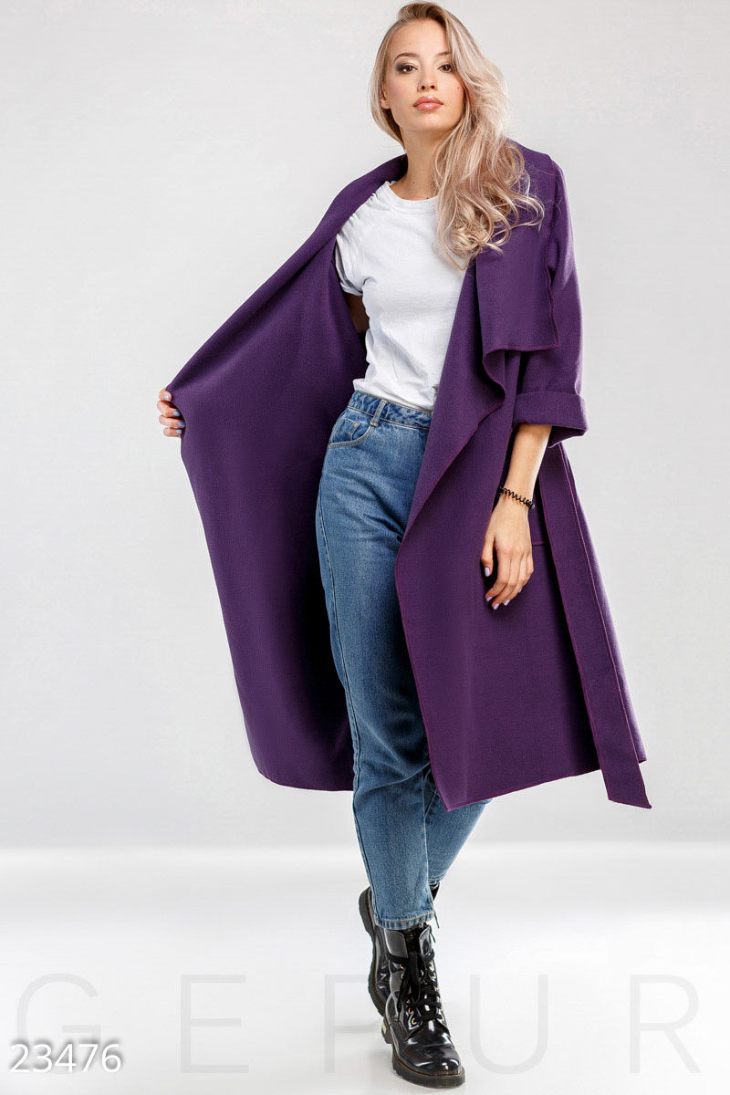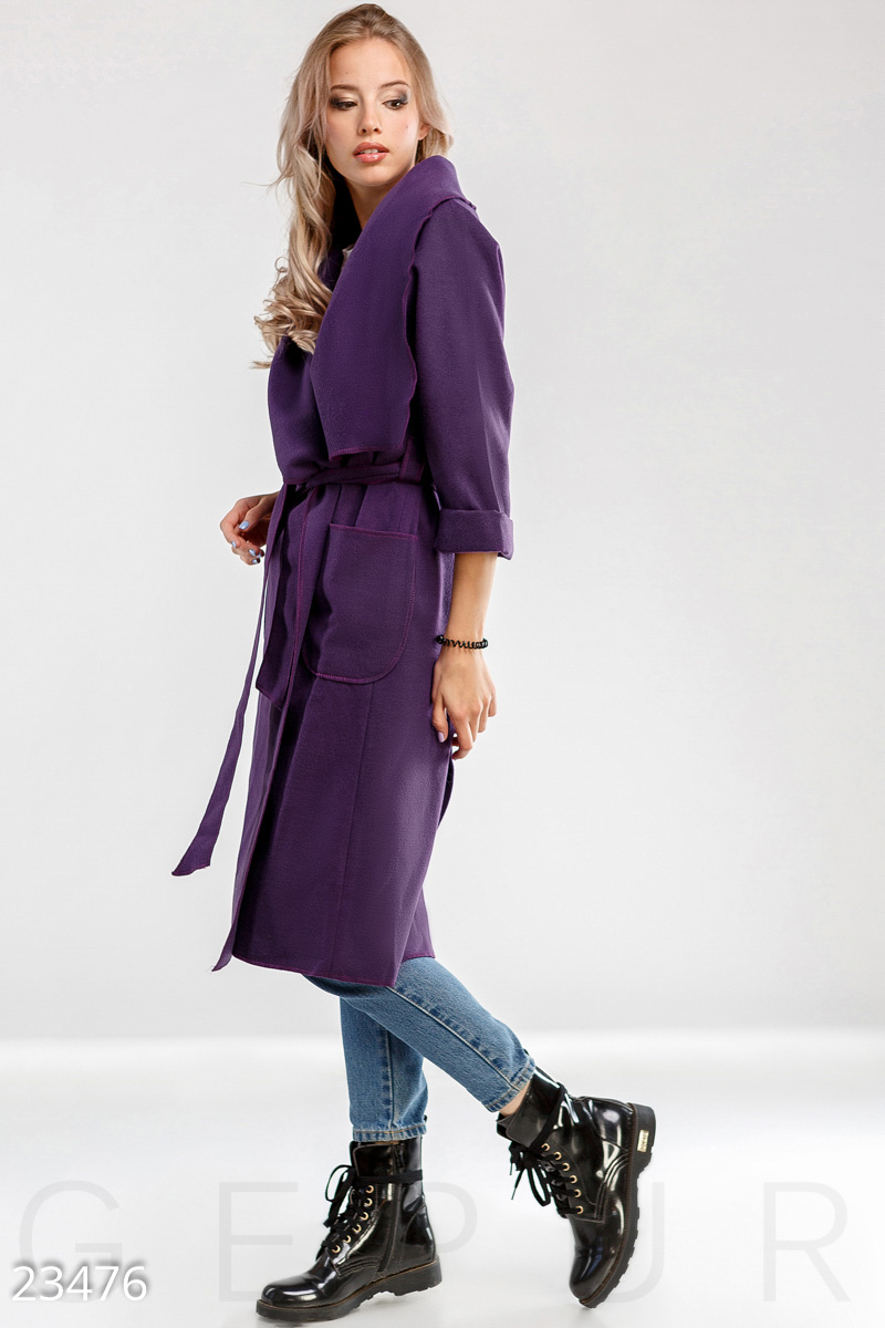 Стильное демисезонное пальто из эко-кашемира: рукав 3/4 с фиксированным отворотом, асимметричные лацканы, съемный пояс в тон и два больших накладных кармана.