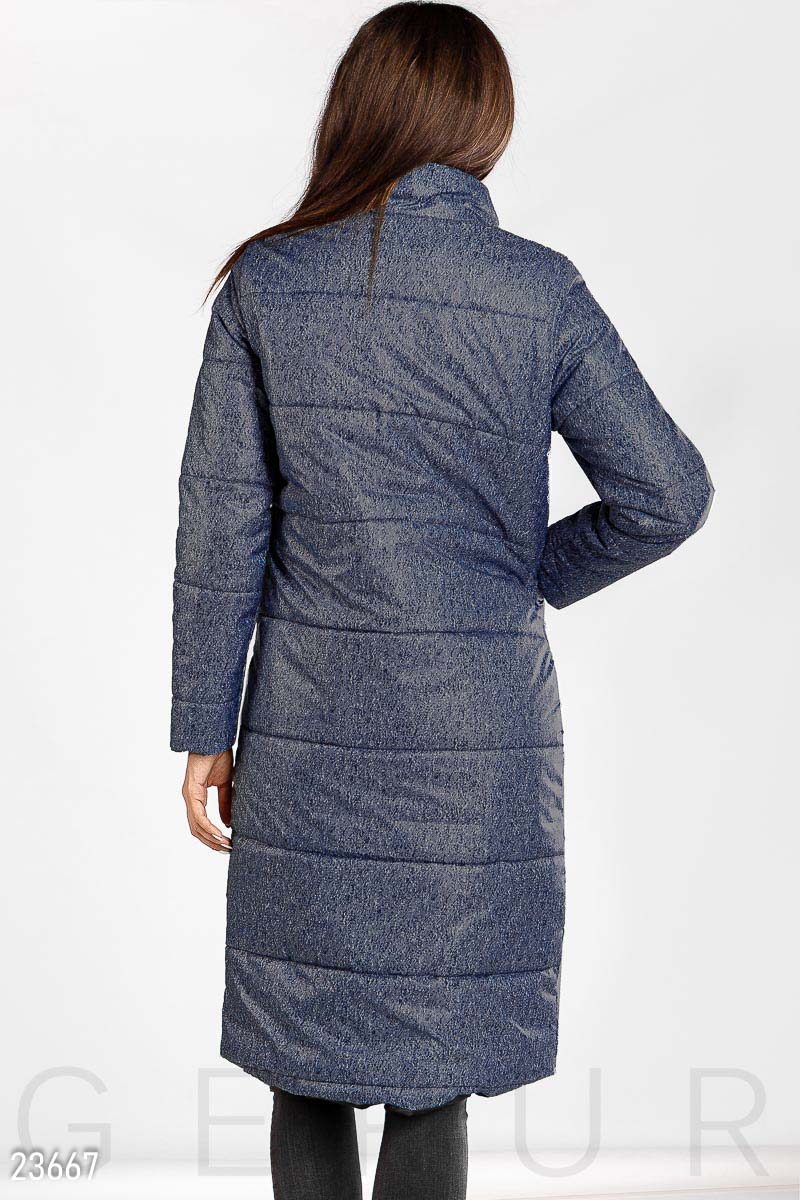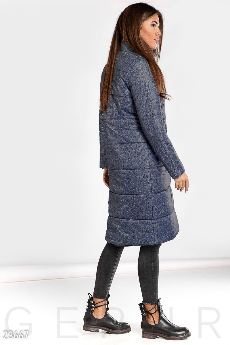 Длинное зимнее пальто из стеганой плащевой ткани с принтом: высокий воротник-стойка, длинный рукав без манжет и два прорезных кармана по бокам.