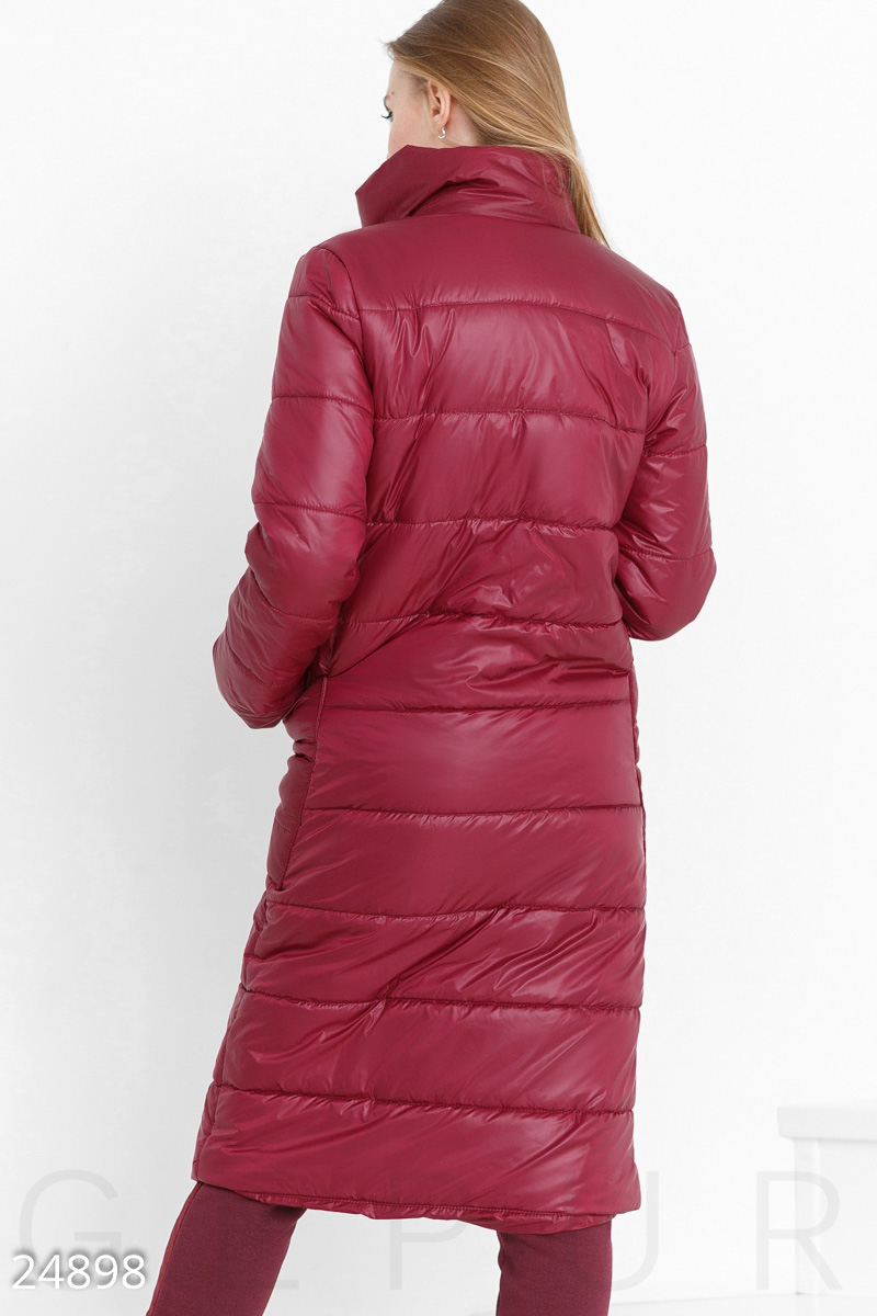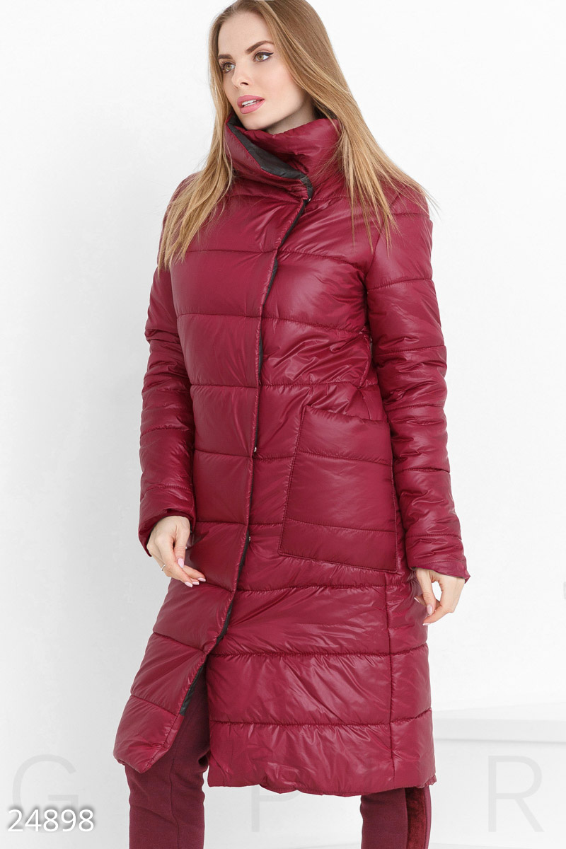 Зимнее пальто из плащевой ткани с воротником-стойкой, двумя большими накладными карманами и асимметричной застежкой.