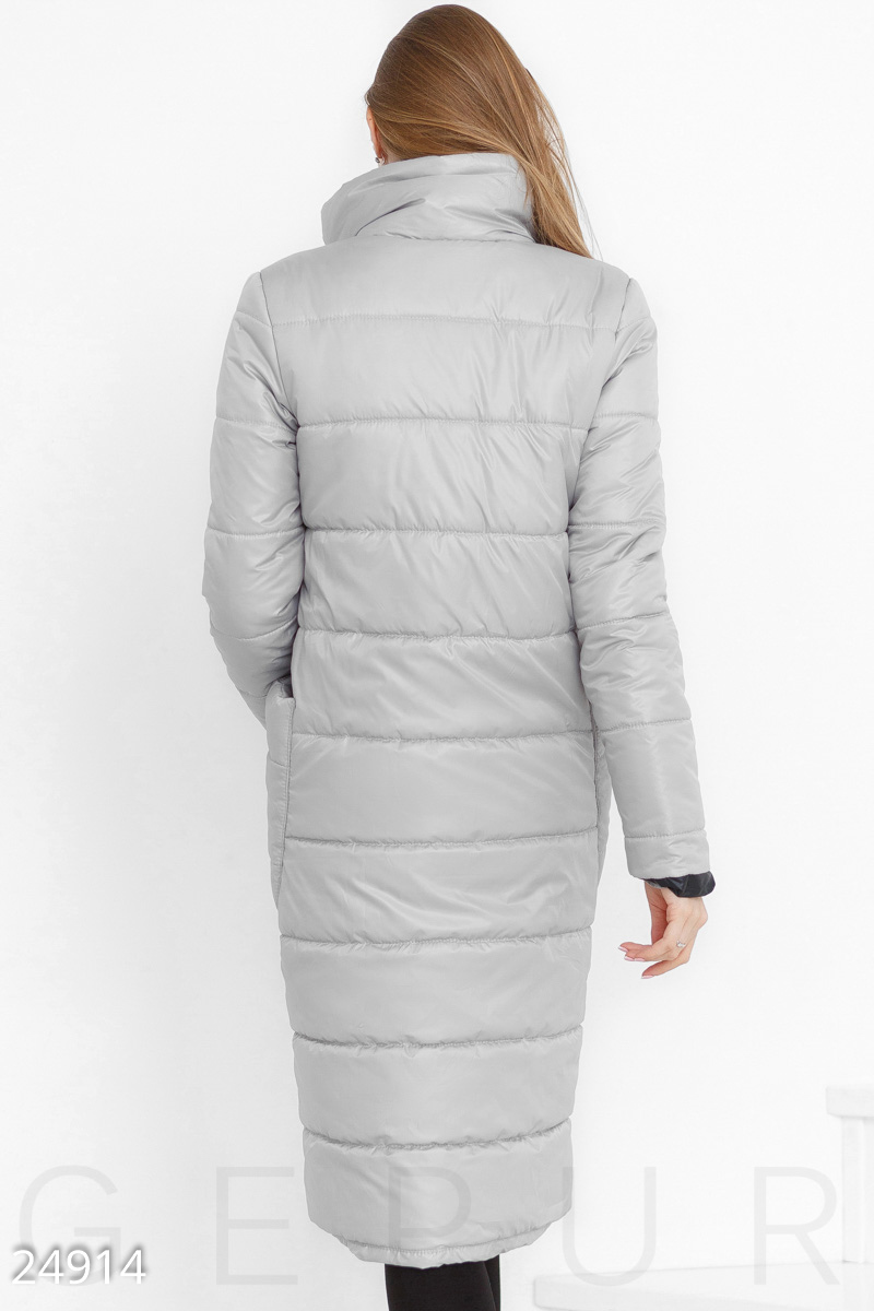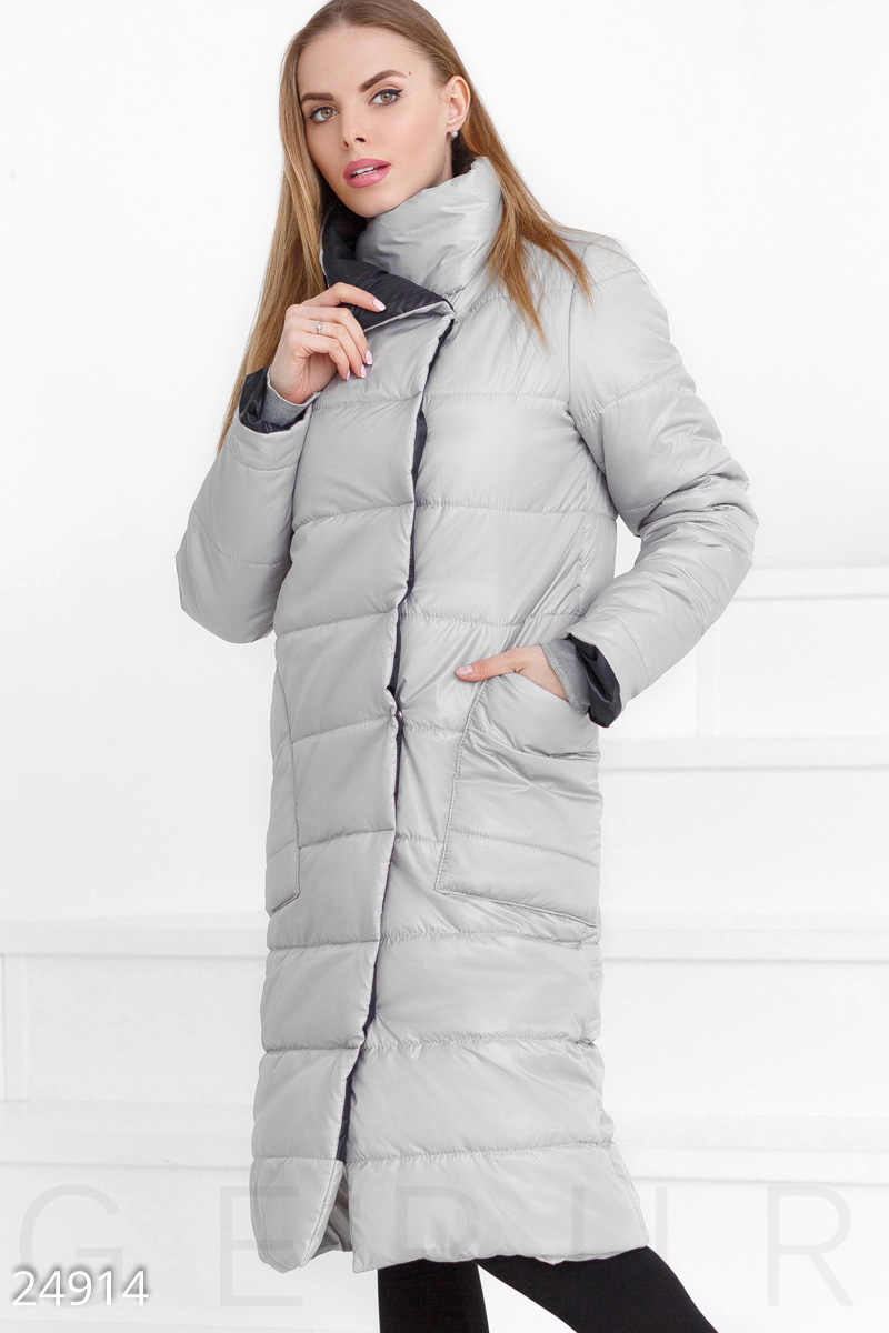 Зимнее пальто из плащевой ткани с воротником-стойкой, двумя большими накладными карманами и асимметричной застежкой.