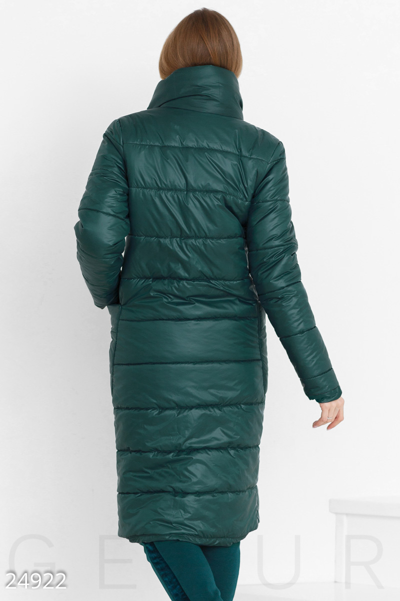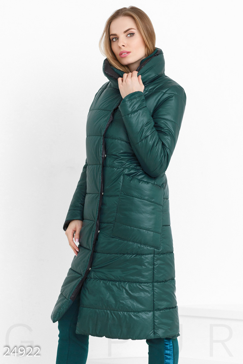 Зимнее пальто из плащевой ткани с воротником-стойкой, двумя большими накладными карманами и асимметричной застежкой.