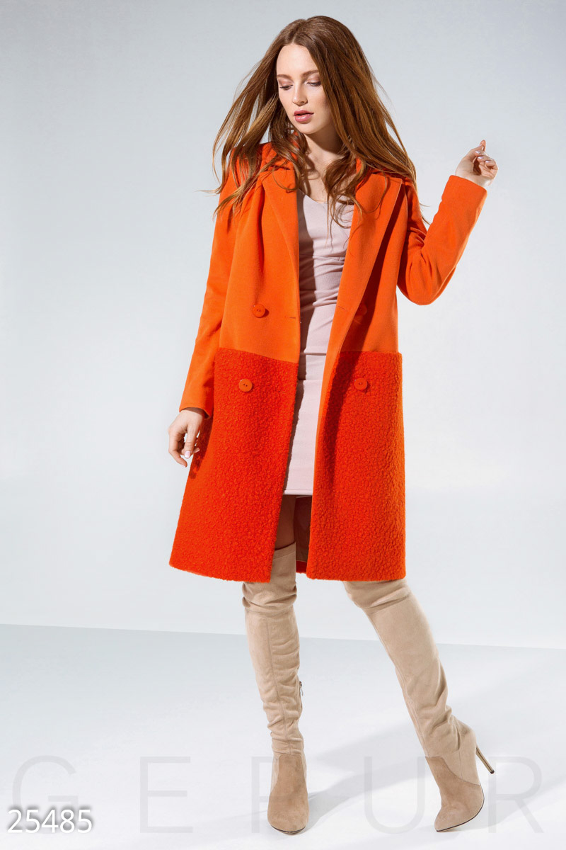 Двубортное пальто, выполненное из пальтовой ткани premium класса: классический отложной воротник с аккуратными лацканами, два прорезных кармана и пришивной подол с фактурной отделкой.