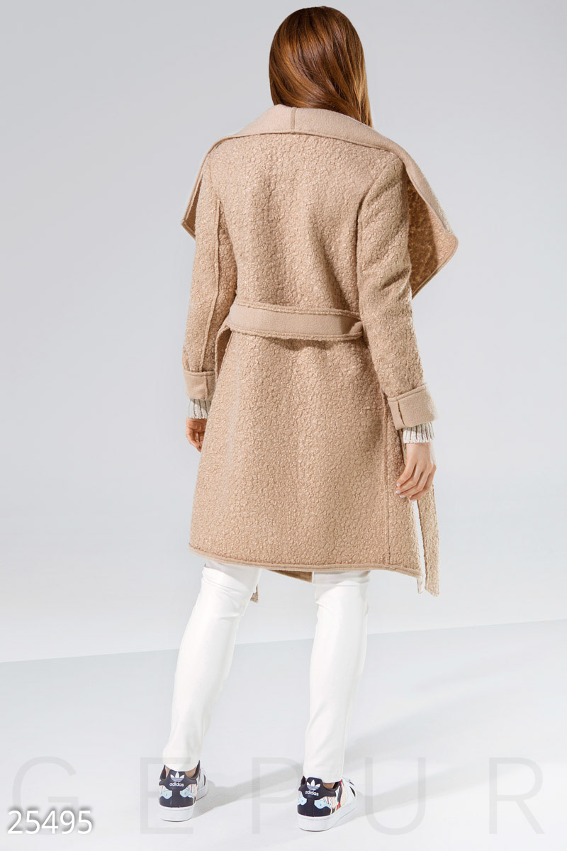 Демисезонное пальто на запáх, выполненное из фактурной пальтовой ткани premium класса: отложной воротник с асимметричными лацканами, съемный пояс и два больших накладных кармана.