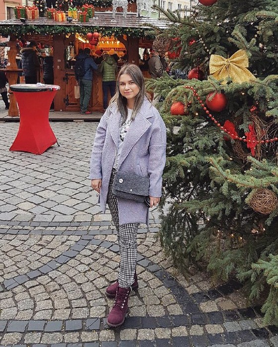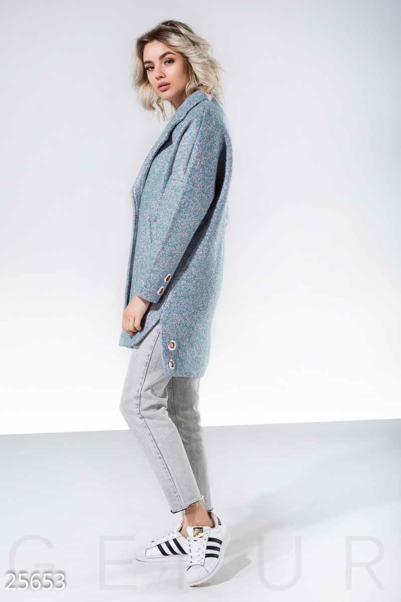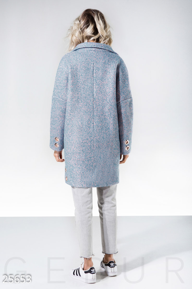 Люверсы на пальто заметила только после того как получила) Цвет очень красивый в розово-голубую крошку. Садится свободно, для тех,кто любит по фигуре,можно на размер меньше брать