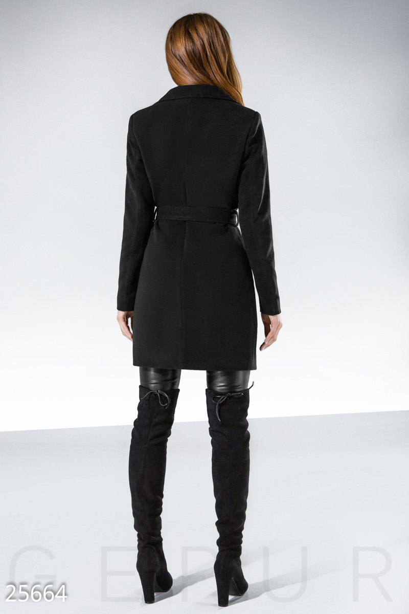 Оригинальное пальто из эко-кашемира со съемным поясом в тон и бахромой, выполненной из эко-кожи.