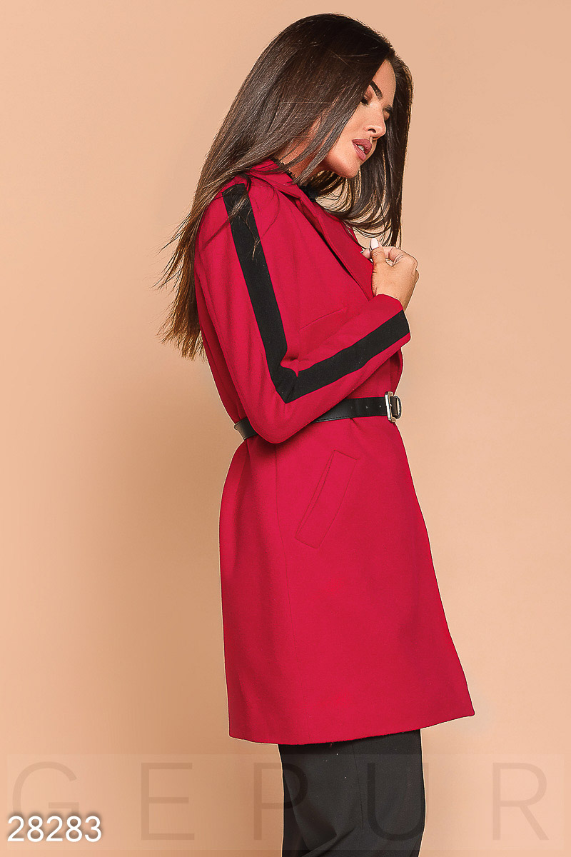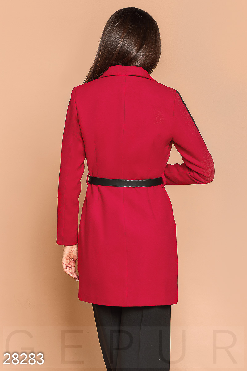 Двухцветное пальто из эко-кашемира: отложной воротник с лацканами, длинный рукав с контрастной вставкой на лицевой стороне, два кармана по бокам и съемный ремешок из эко-кожи, который выполняет функцию застежки.