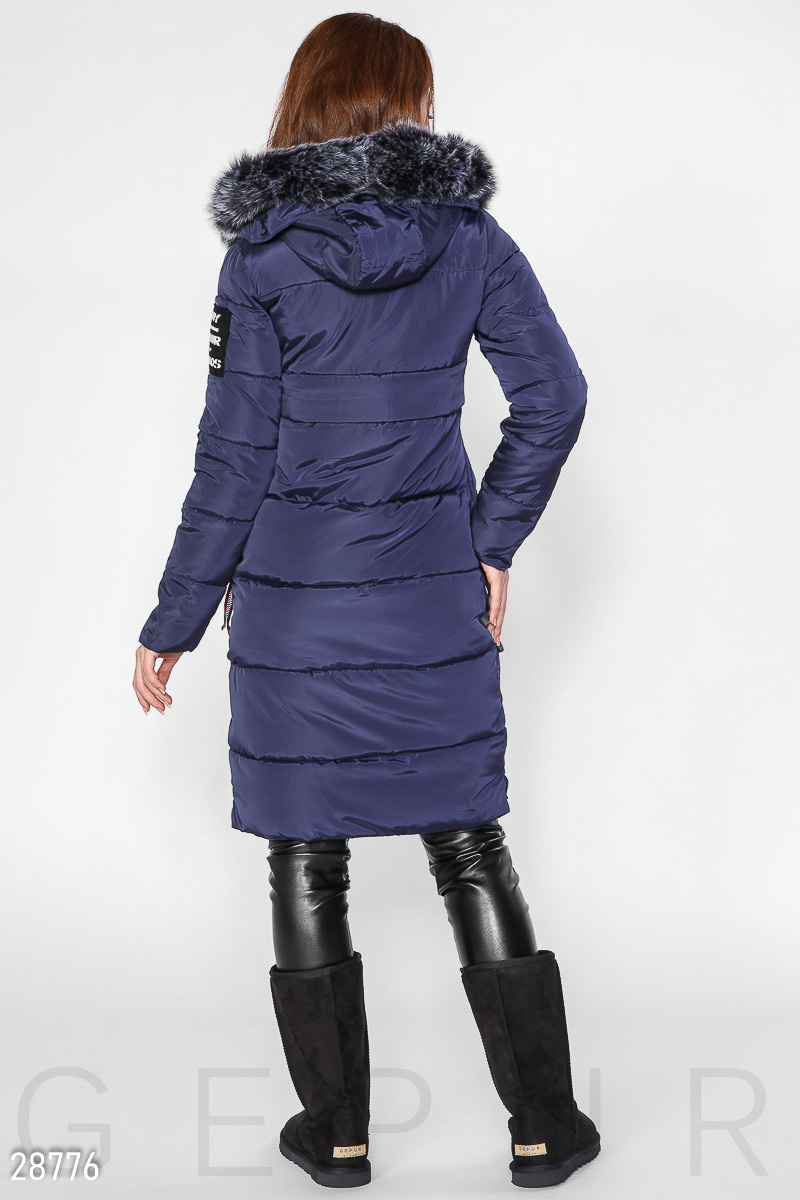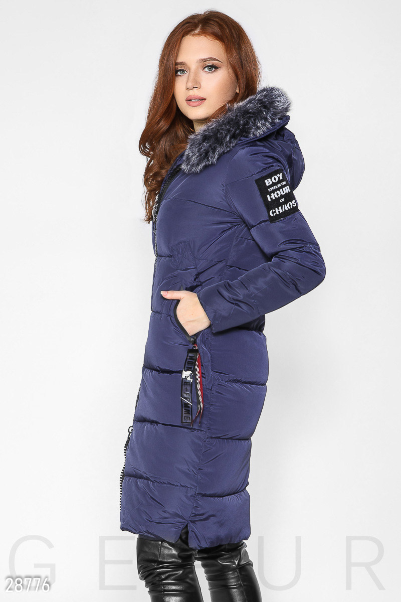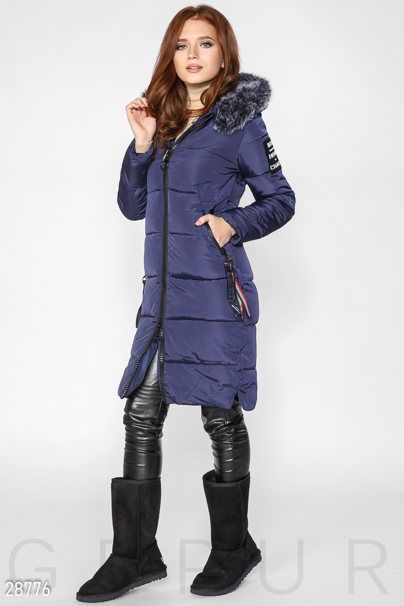 Теплое зимнее пальто, выполненное из стеганой плащевой ткани: удобный капюшон со съемным эко-мехом, длинный рукав с объемной нашивкой, два кармана на молнии с декором и небольшие разрезы по бокам.