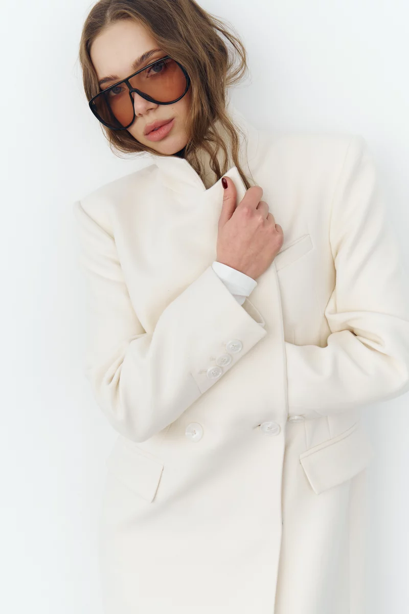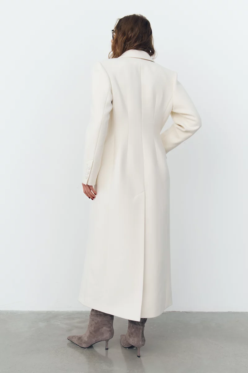 Длинное двубортное пальто со слегка подчеркнутой талией. Модель выполнена из пальтовой ткани с преимуществом шерсти в составе. Пальто застегивается на пуговицы и скрытые кнопки, имеет высокий разрез сзади. На подкладке